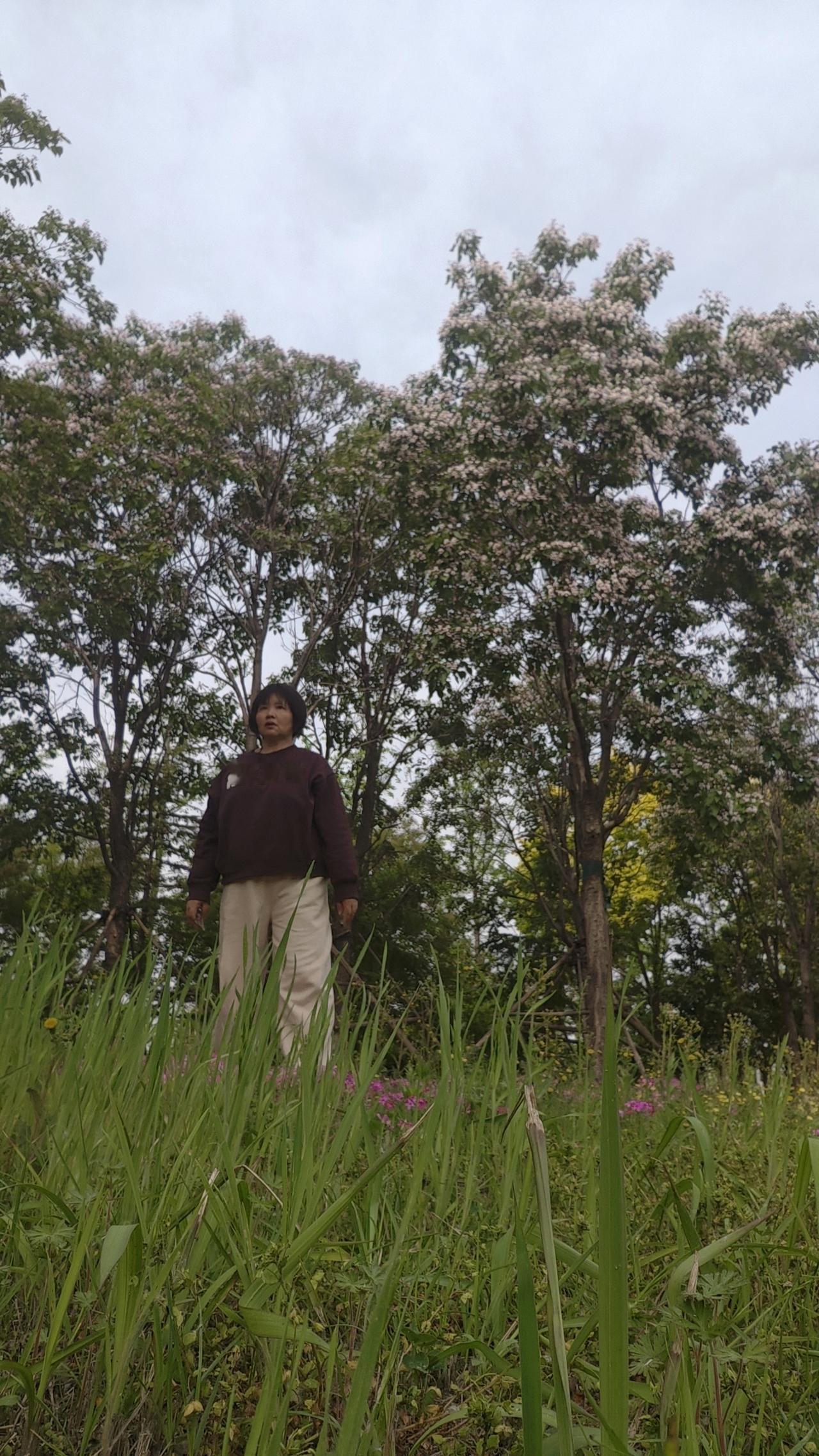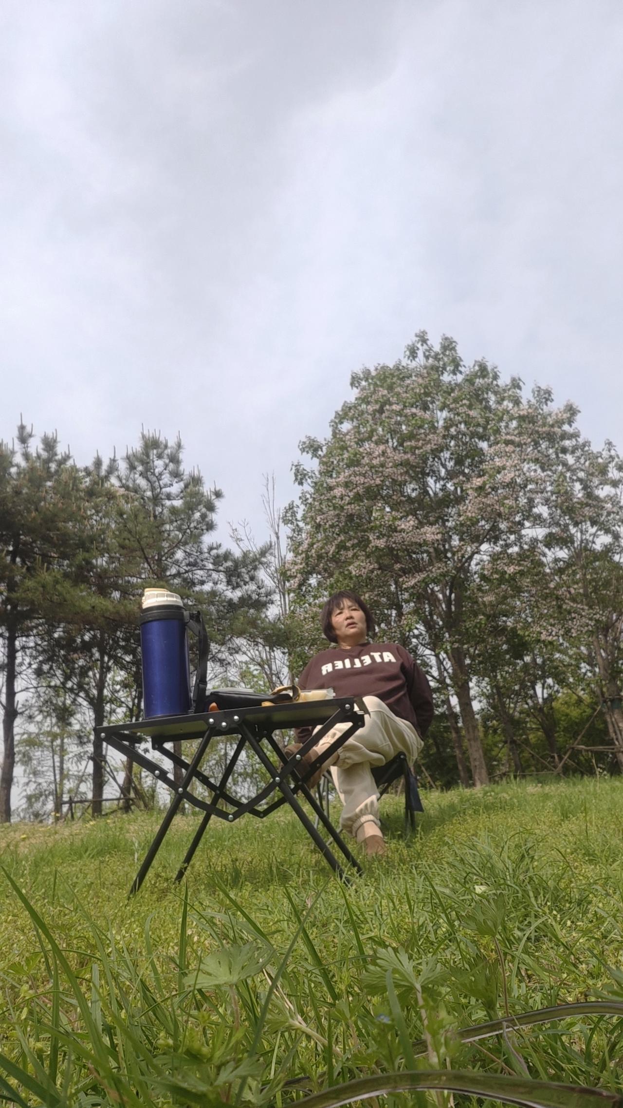骑到累了,便在草地上支起小桌,铺开折叠椅。倒一杯温水,就着清甜的水果慢慢歇脚。抬头是云影悠悠的蓝天,身旁是开得热烈的粉花与黄菊,远处的树木在风里轻轻摇晃,连时光都慢了下来。