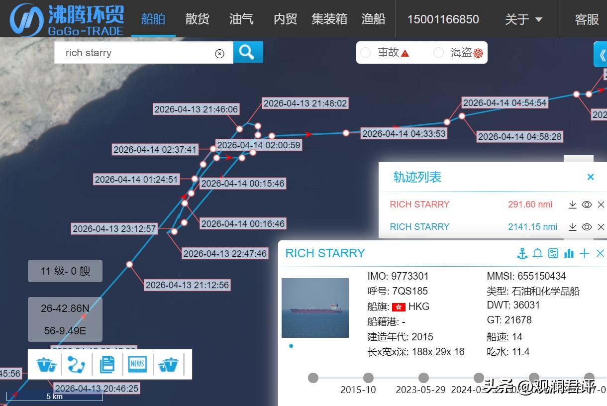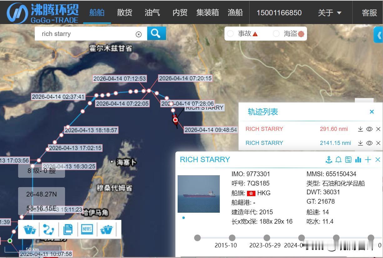 北邮潘教授的沸腾环贸平台显示:Rich Starry船的确短暂调转过航行,1个小时后恢复前行,目前该船已经基本驶离霍尔木兹海峡。