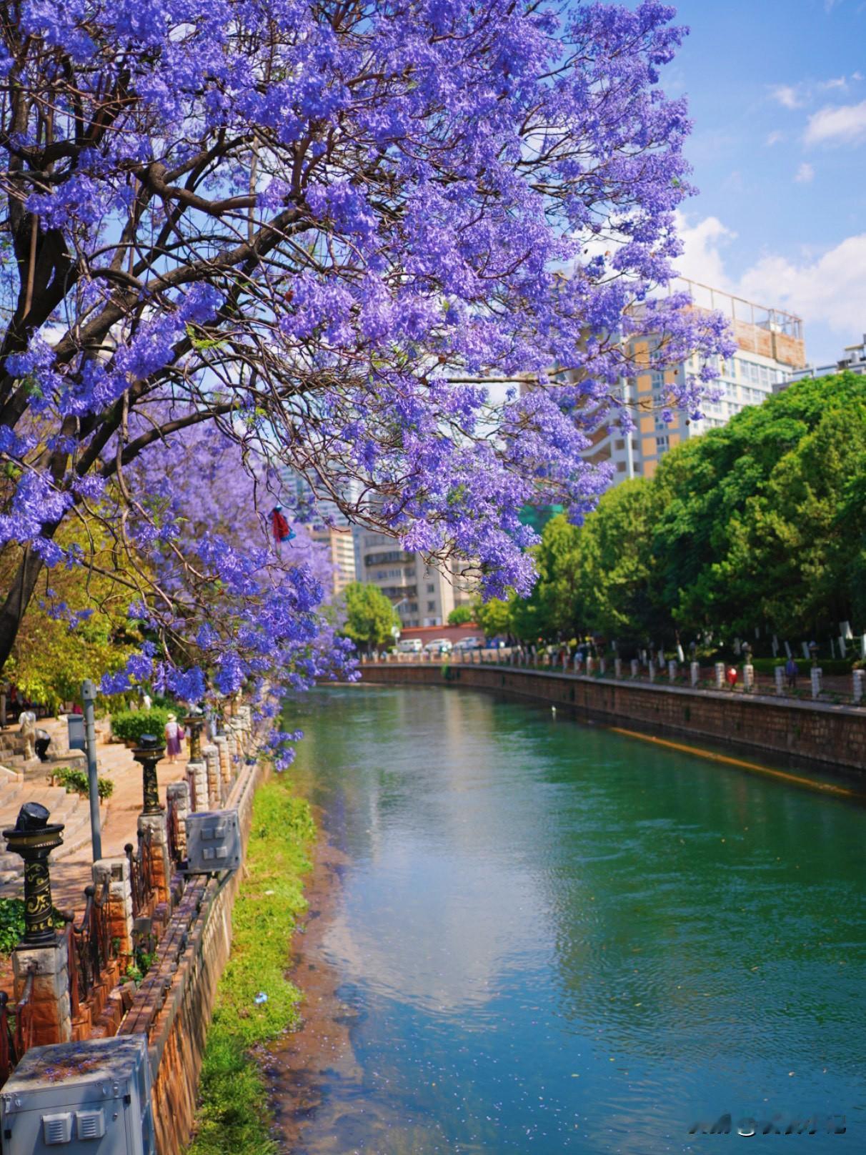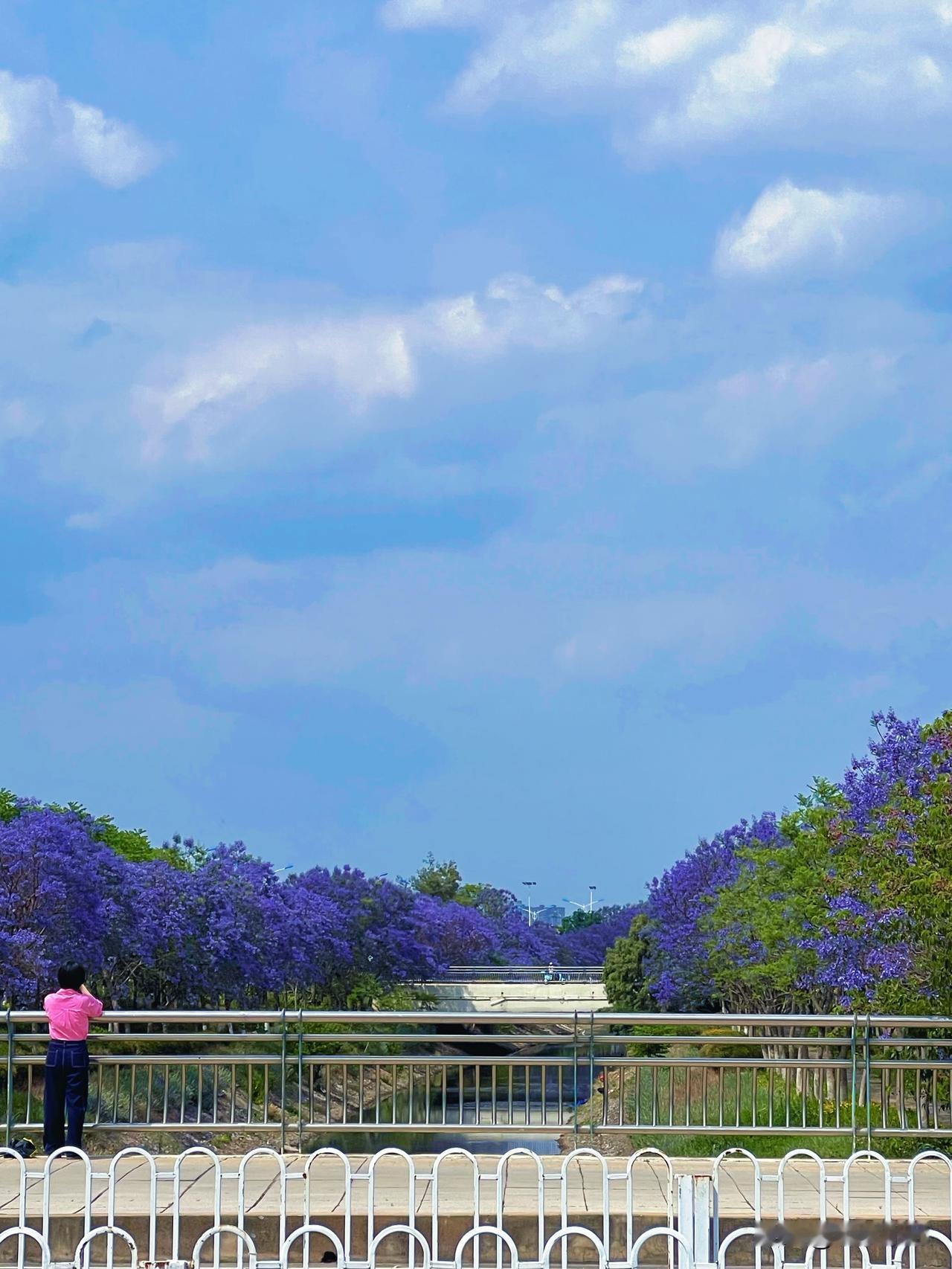 导航到滇池会展西路,蓝花楹沿着河边种植,视野开阔,停车方便,而且树的高度刚刚好,不用梯子也能轻松合影