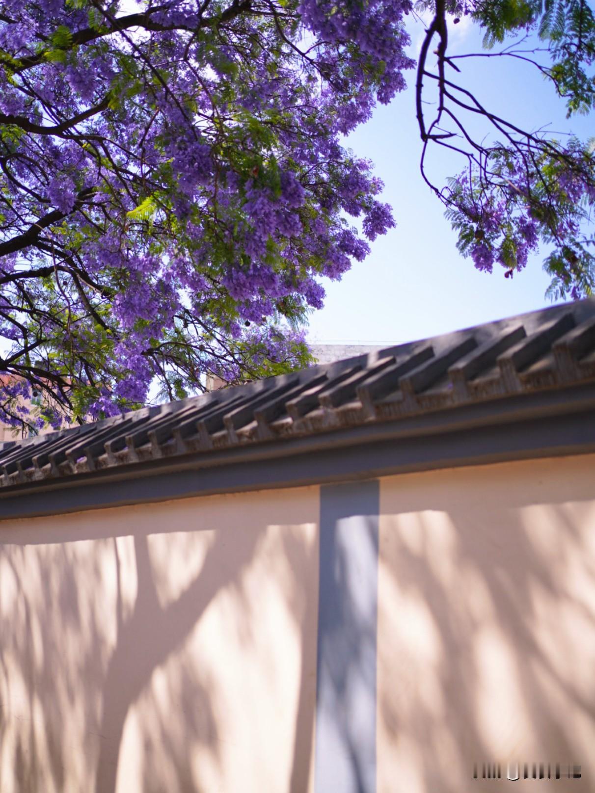 这里的蓝花楹与仿古城楼、碉楼、水池交相辉映,营造出“推门即穿越”的诗意氛围。