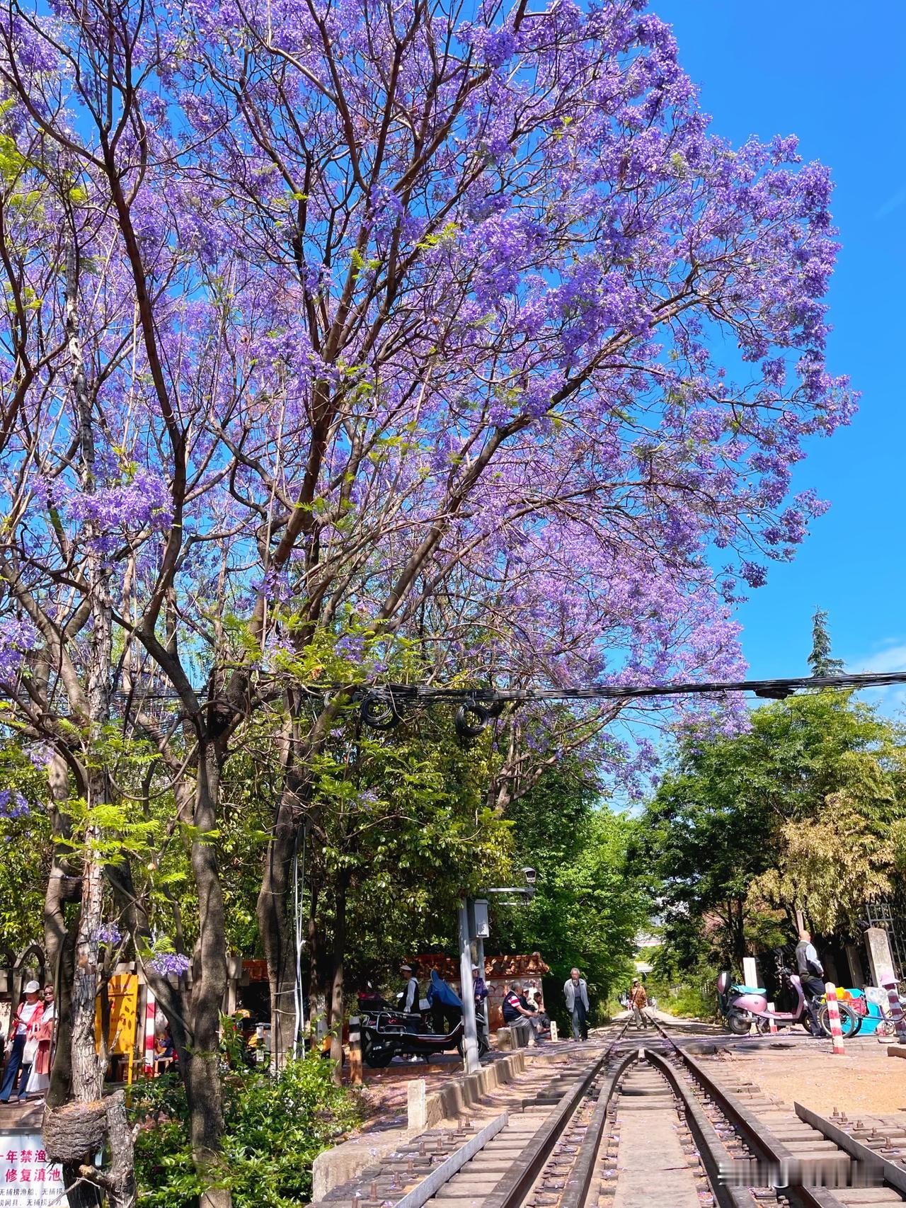 顺着铁路走到江边,这里除了蓝花楹,还有大片的三角梅。废旧铁轨搭配蓝花楹,非常有复古文艺气息,适合拍情绪片