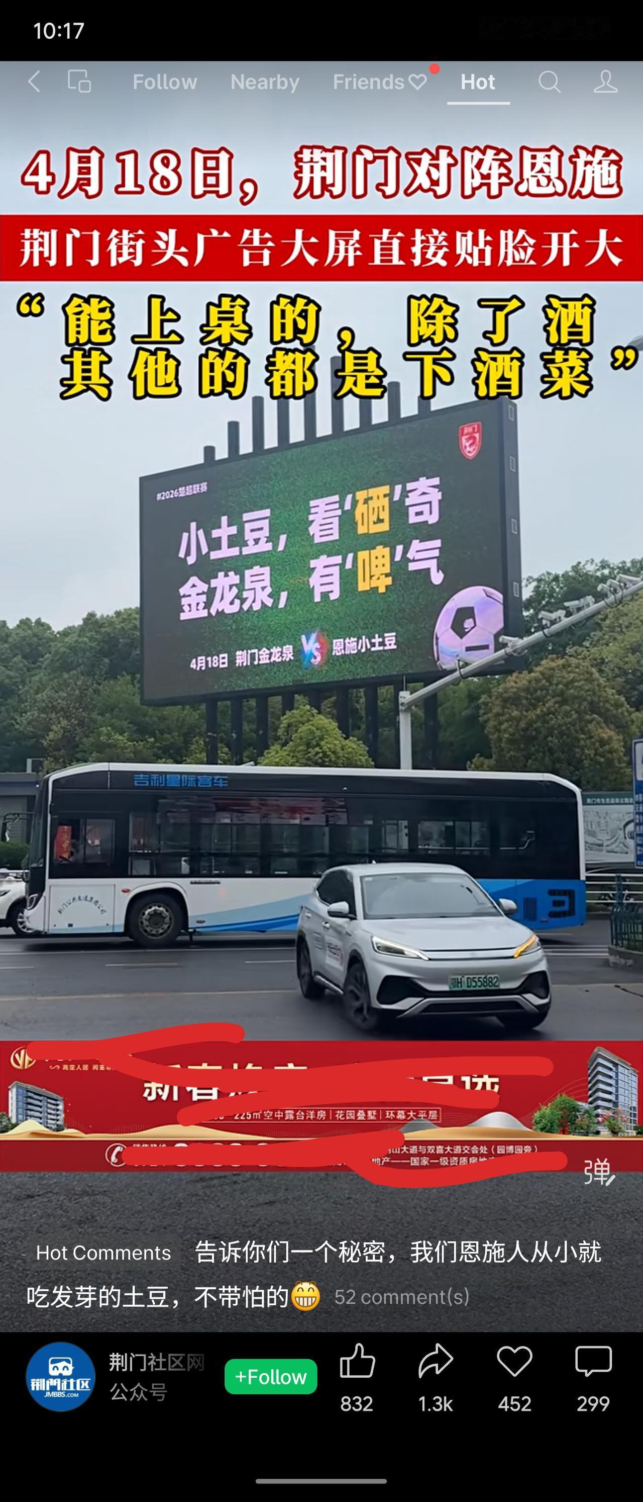 荆门为对阵恩施,在街头大屏“贴脸开大”:能上桌的,除了酒,其他都是下酒菜——暗讽恩施小土豆只能当配菜。网友神调侃:“我们恩施人从小就吃发芽土豆,不带怕的。”小土豆有“硒”奇,金龙泉有“啤”气,赛前嘴仗先赢一局。