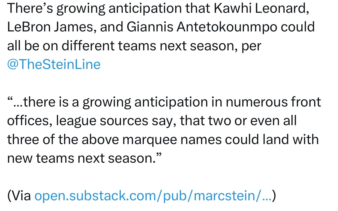 Marc Stein:越来越多的人预计,伦纳德、詹姆斯和扬尼斯下赛季可能效力于新的球队。