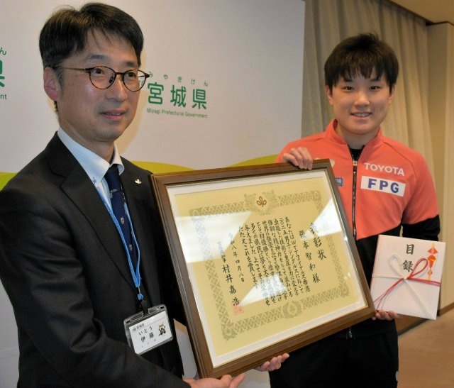 在县政府举行的授奖仪式上,张本选手从副知事伊藤哲也手中接过了表彰状以及价值3万日元的仙台牛礼券。他表示:“今后也会继续努力训练,希望还能再次获得这样的表彰。”