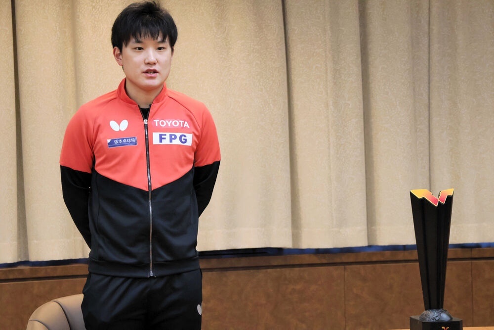 在世界排名前列选手参与的乒乓球职业赛事WTT总决赛男子单打项目中首次夺冠的张本智和选手(仙台市出身、隶属丰田汽车),于8日接受了宫城县的特别表彰。