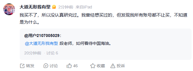 段永平说他账号买不了中国海油,不知道为啥