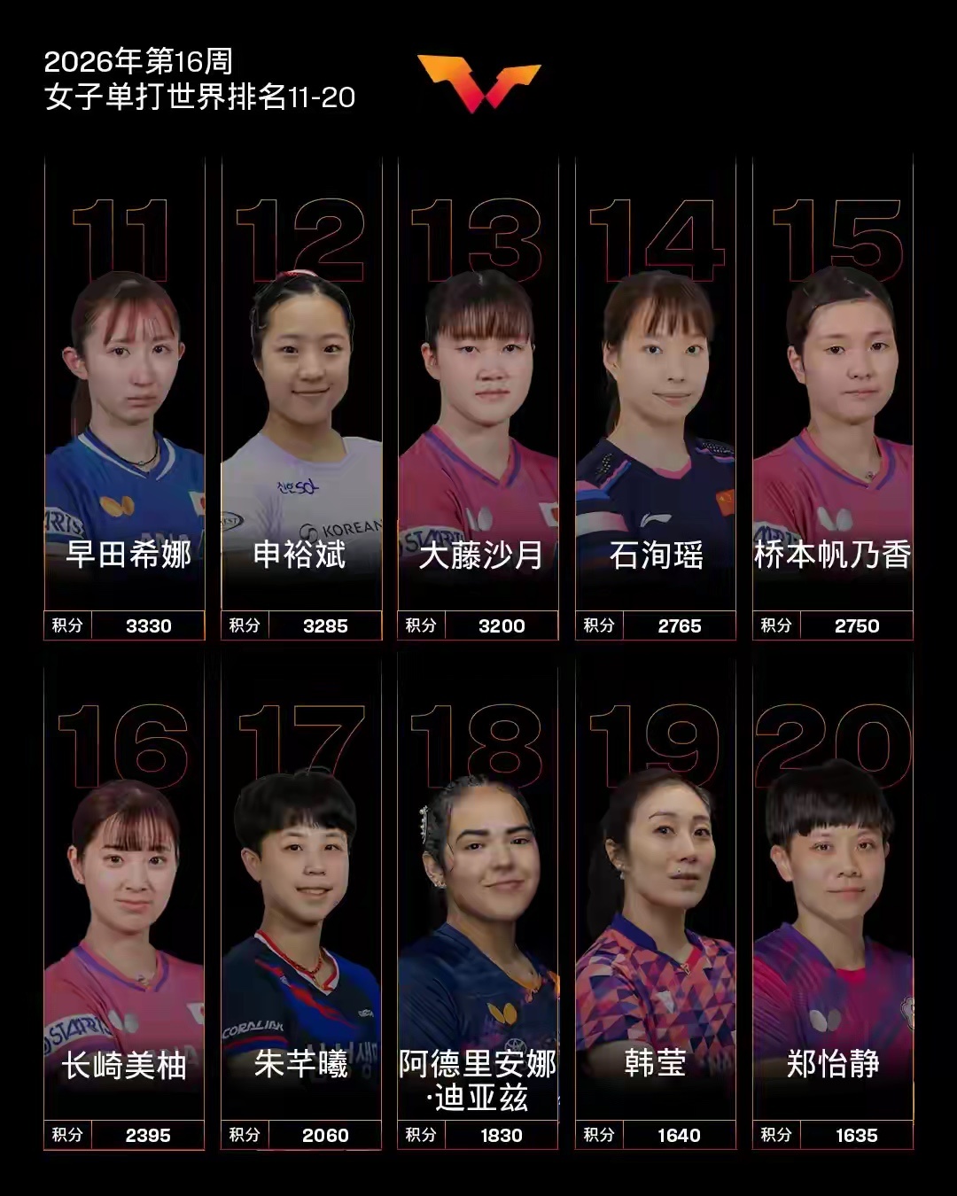 国际乒联公布2026年第16周世界排名:温瑞博升至第11,王曼昱/蒯曼重回女双榜