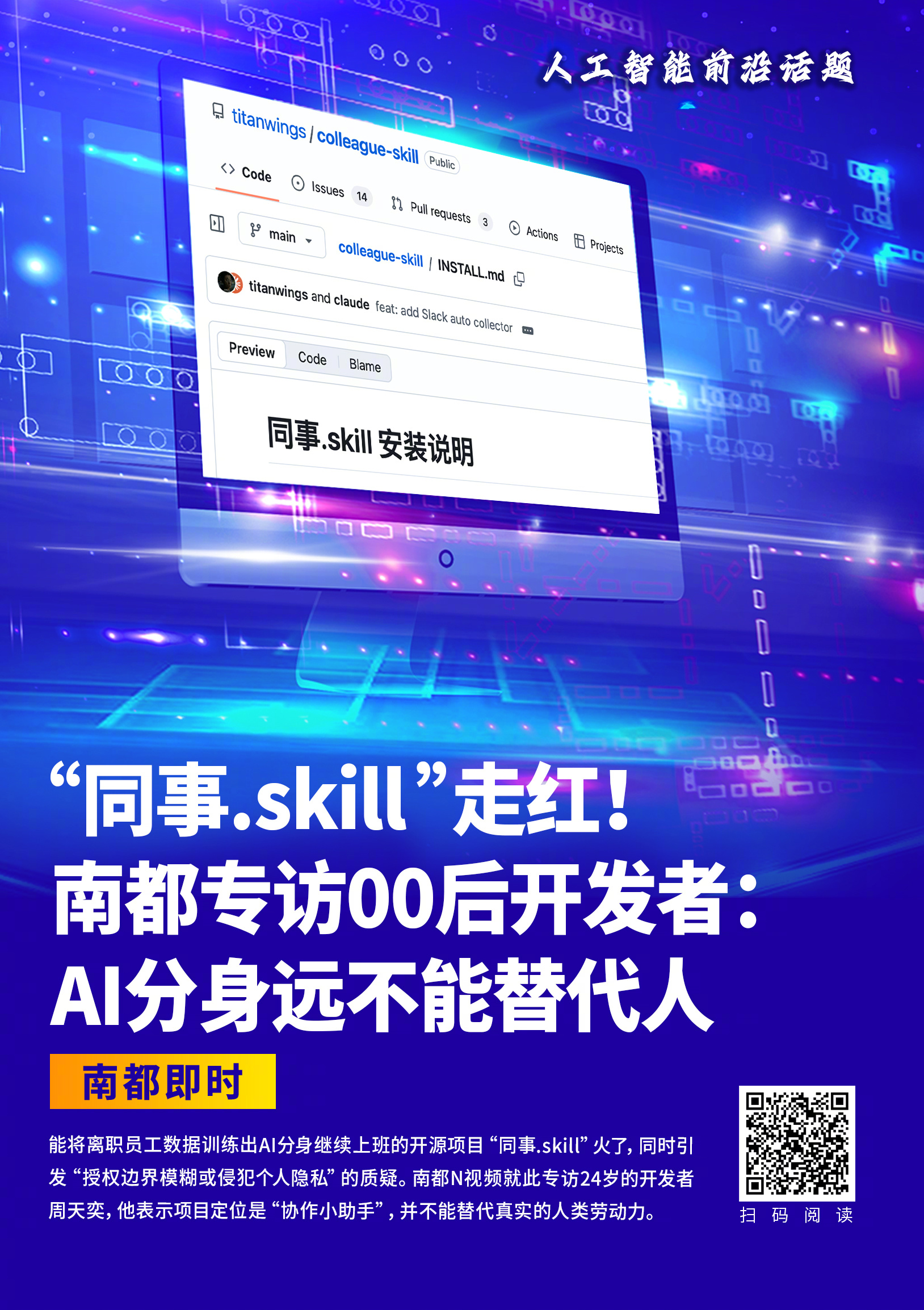 #专访同事.skill开发者#【专访“同事.skill”开发者:AI分身还远不能替代人】#离职员工被训练出AI分身继续上班#“将冰冷的离别化为温暖的Skill,欢迎加入赛博永生!”这是开源项目“colleague.skill(同事.skill)”在简介里喊出的口号。