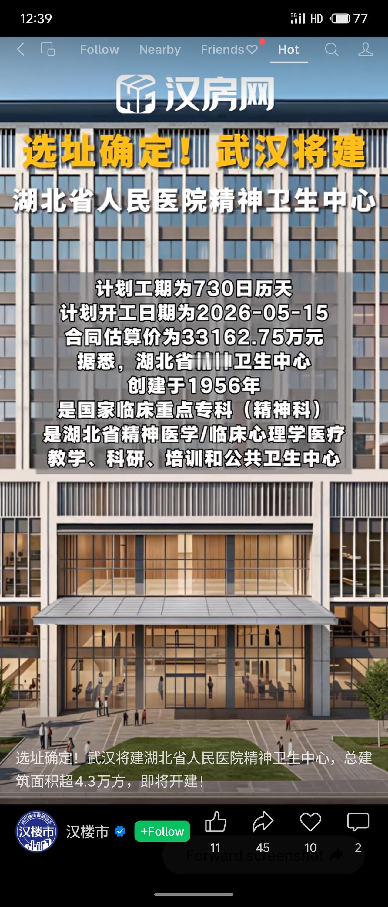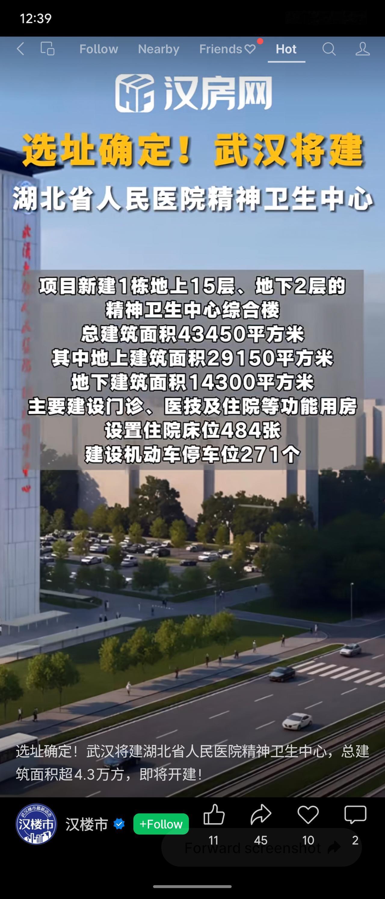 根据公示信息,武汉东湖高新区将新建湖北省人民医院精神卫生中心,选址于高新六路以北、光谷一路以西。项目总建筑面积约4.35万平方米,规划地上15层、地下2层,设置住院床位484张、停车位271个(含充电桩)。计划2026年5月开工,工期730天,总投资约3.32亿元。