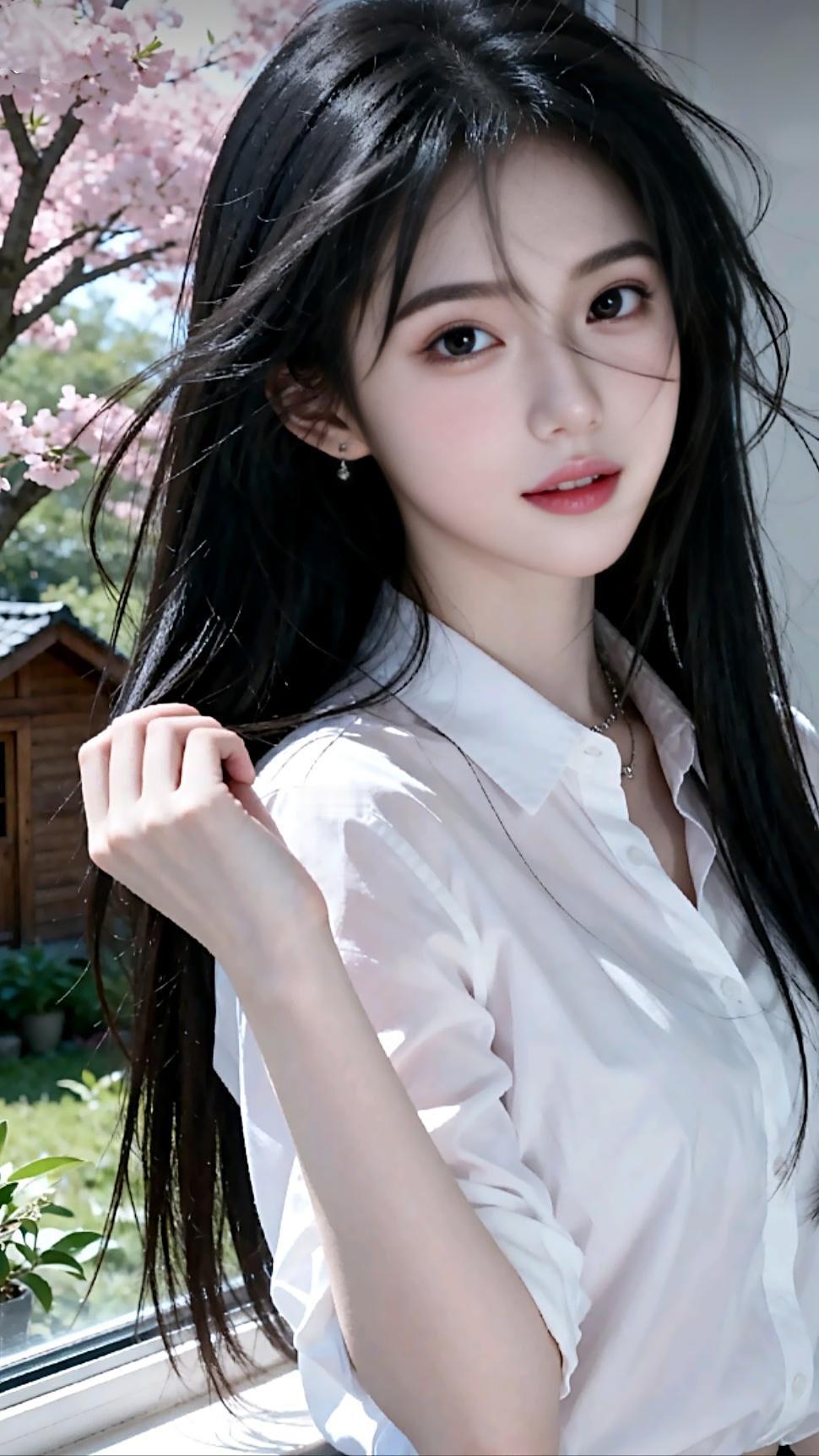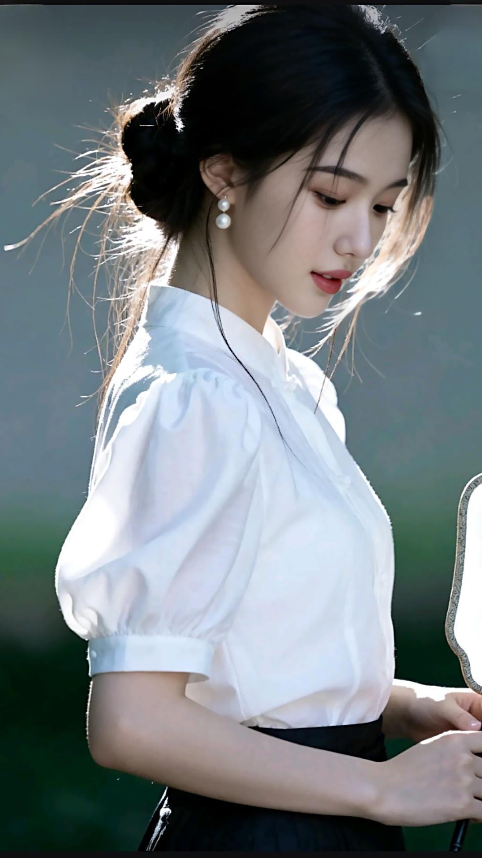 少女静坐窗边,手持团扇,沉思悠远。
