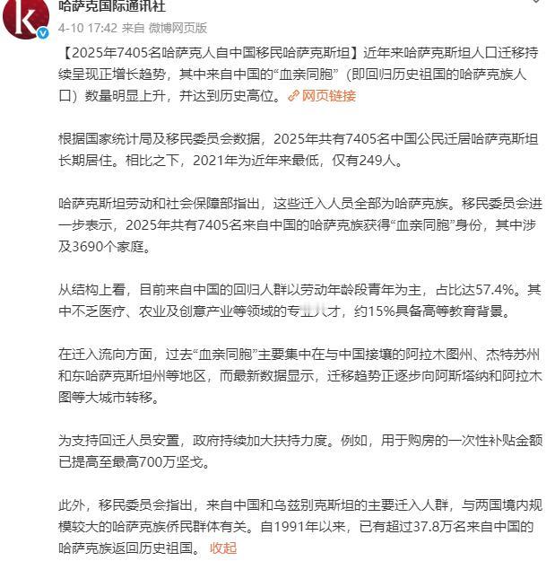 这7405名迁入人员,全部为中国的哈萨克族。自1991年以来,已有超过37.8万名来自中国的哈萨克族人群,返回哈萨克斯坦居住和生活。这是各有所志,留下来的是兄弟,走的也是鼓掌祝福。