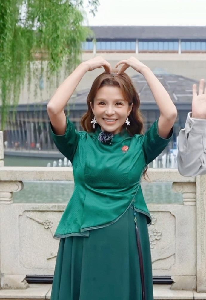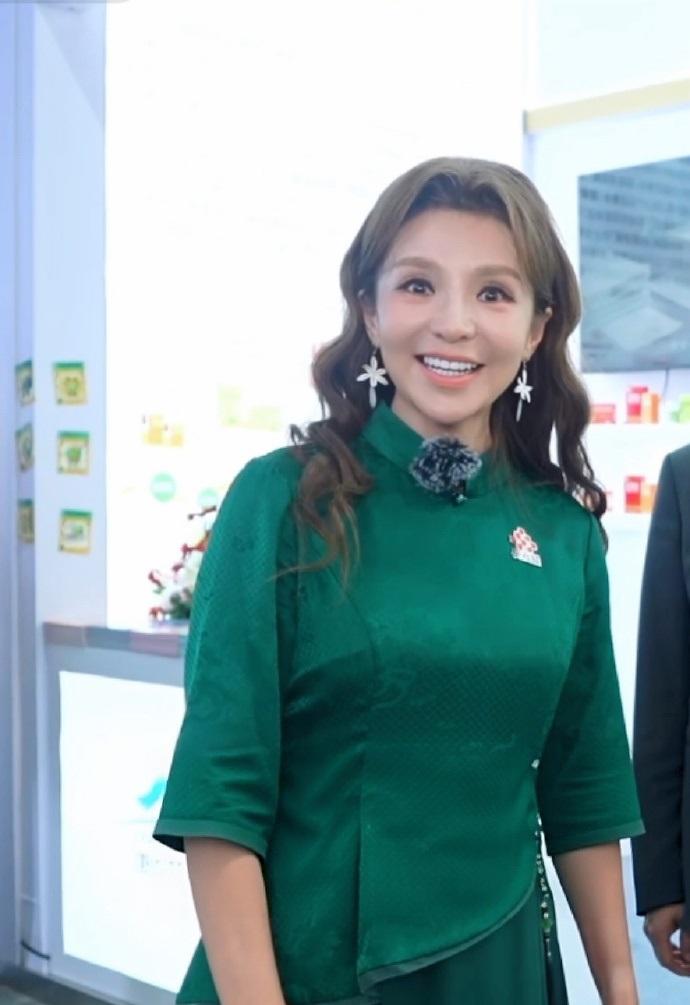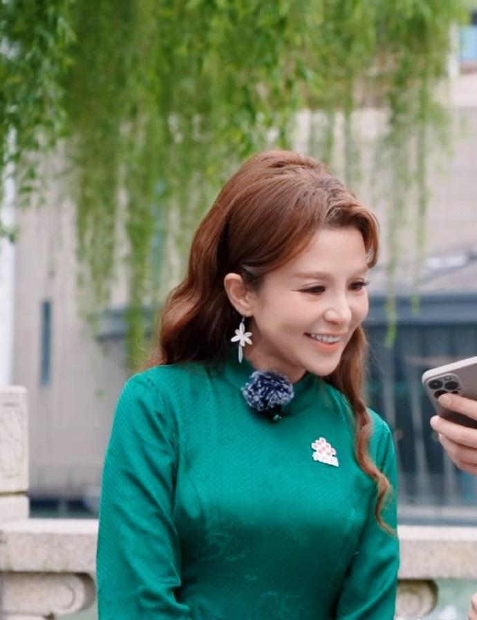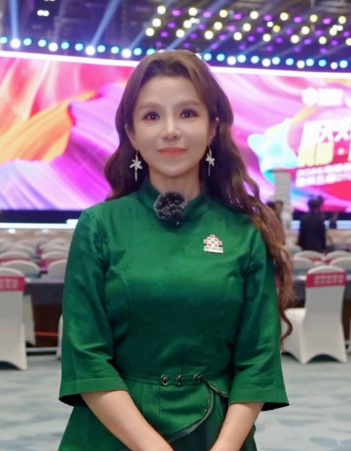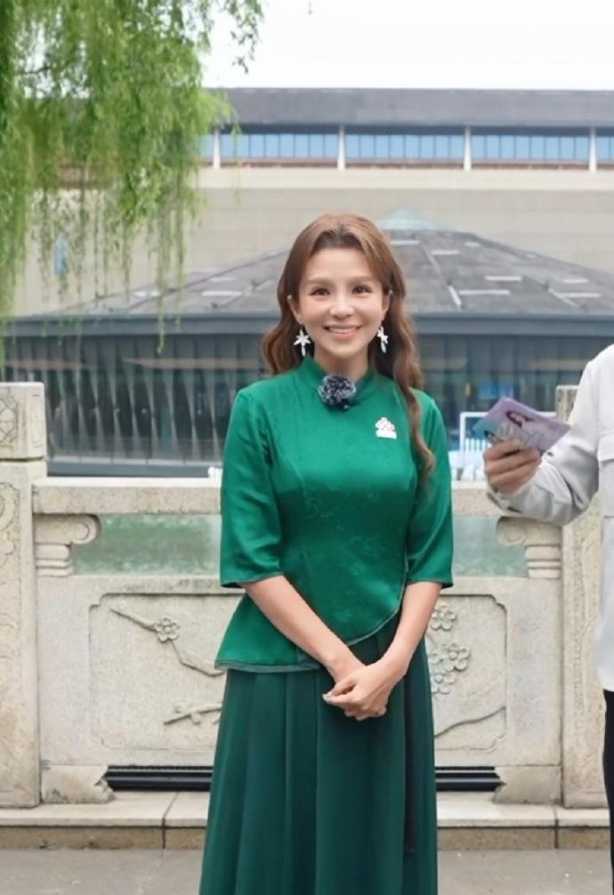 朱迅上身穿绿色的绸缎风服饰,这件衣服上有很时尚的绣花,能够让她展现出了华丽之美。