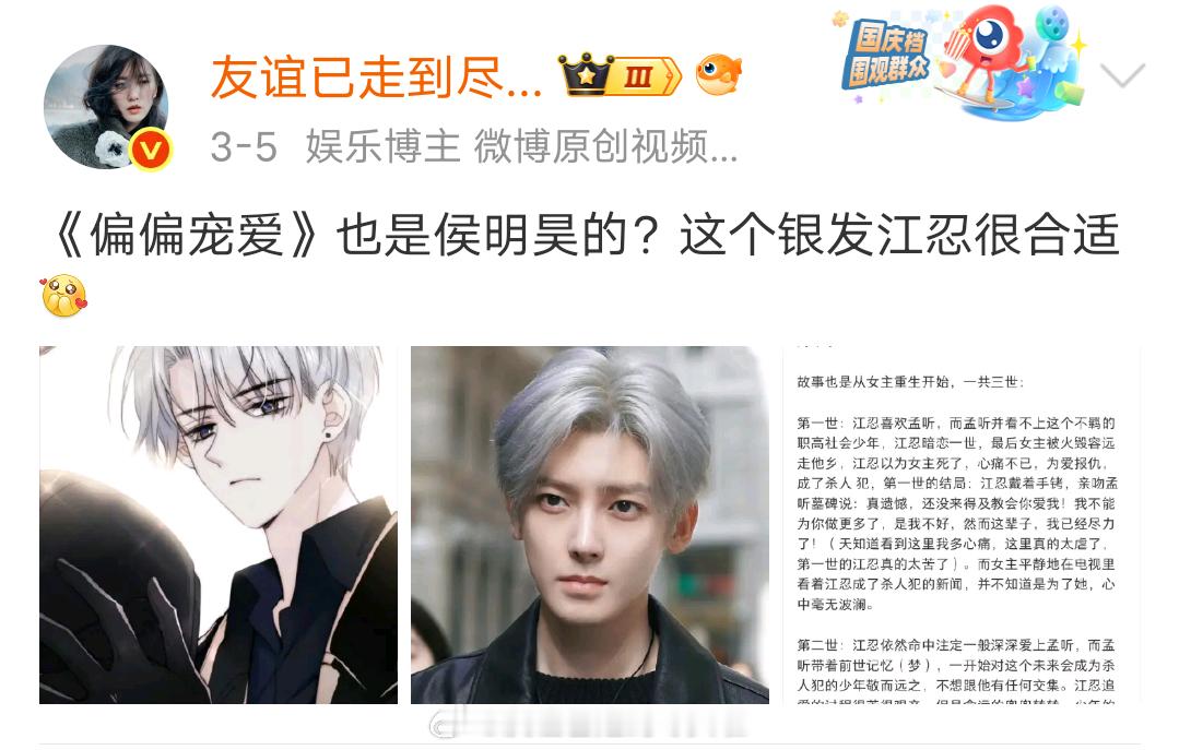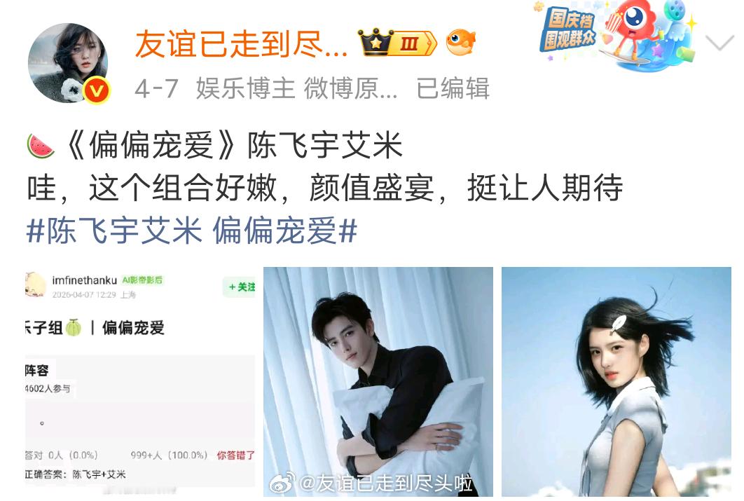 《偏偏宠爱》男主从侯明昊到陈飞宇到闫桉,男主一路降级,项目评级也是一降再降。传到闫桉的时候,还让瓜主帮忙锁饼,强行上桌95生。现偶大IP就是要找流量生,流量越大越好,找新人和糊生只会扑得无声无息。。。偏偏宠爱 闫桉 偏偏宠爱