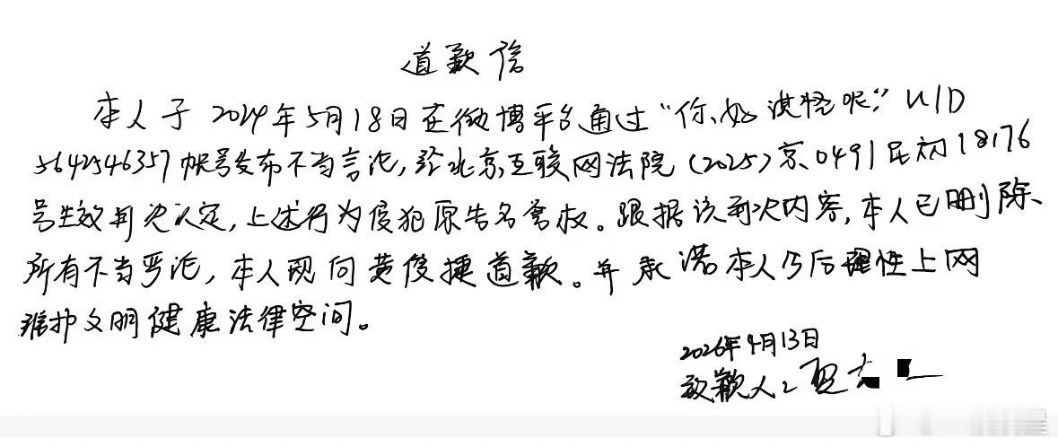 喜报!黄俊捷名誉维权案再胜诉,黑粉手写道歉信安排! 重点来了:这位道歉的成毅粉丝,两年前刚给任嘉伦道过歉,如今又给黄俊捷递上道歉信,追星追成“反复道歉专业户”了~