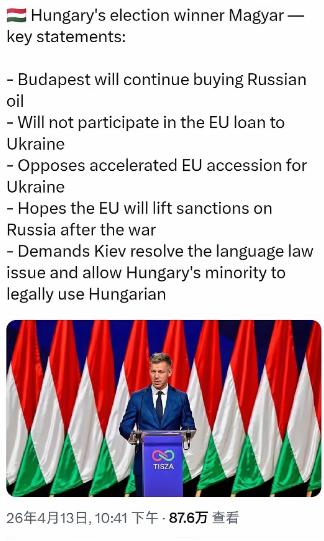 匈牙利新总理马加尔刚当选,连就职仪式的流程还没走完,就直接放出狠话,公布的对外态度,每一条都不藏着掖着,完全不看欧盟的脸色,甚至敢直接跟欧盟唱反调,这刚上任的架势,直接把外界看懵了。