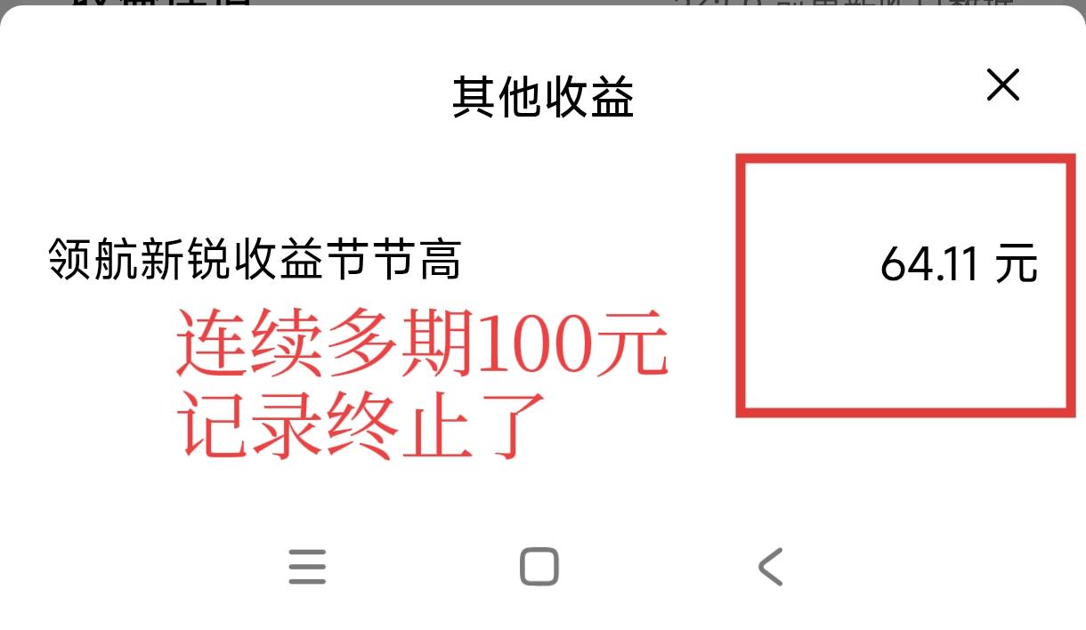 芭比扣了,上一周的“领航新锐收益节节高”奖励只有64.11元,连续多期的100元奖励记录终止了。