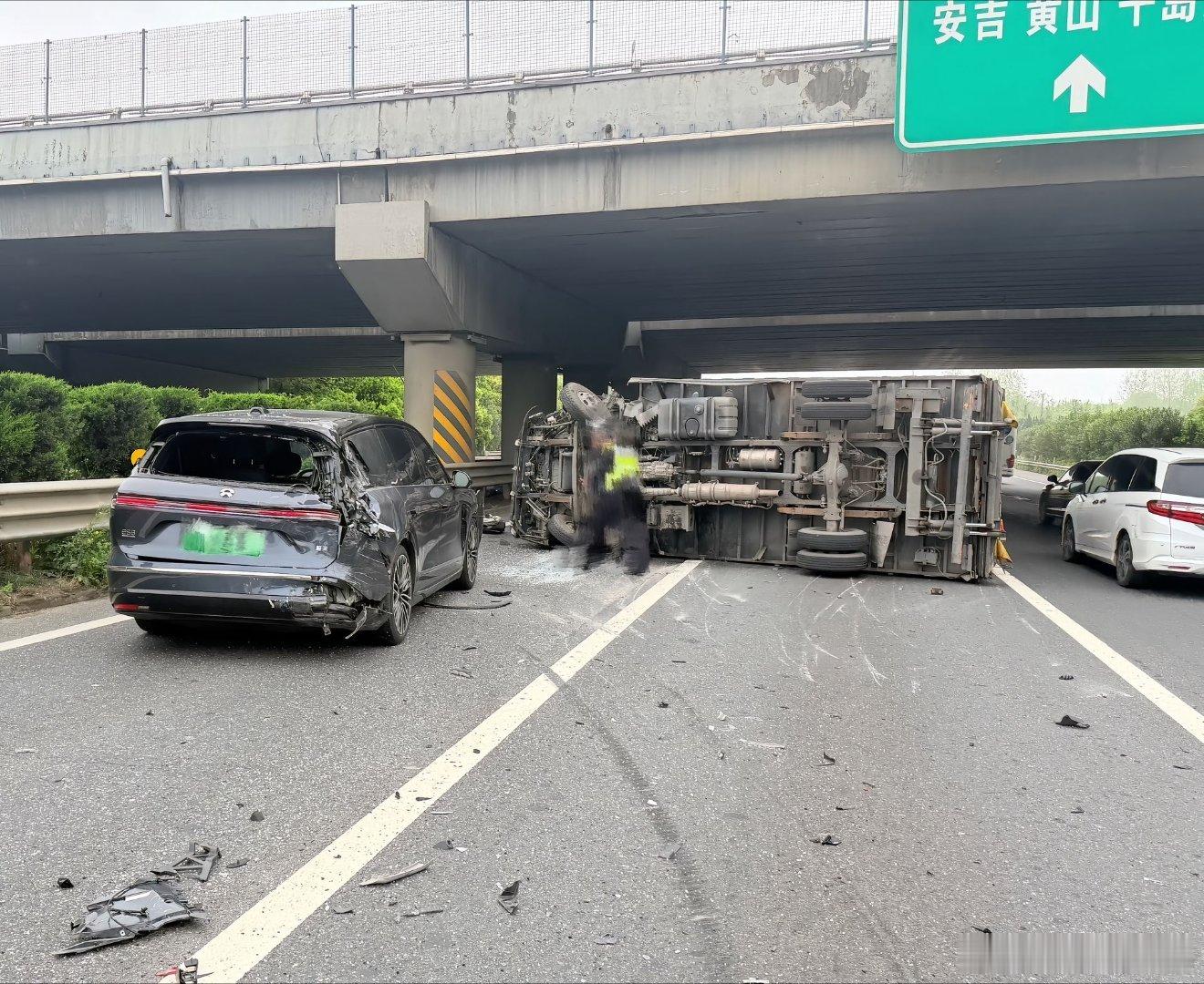 这个蔚来撞翻大货车的图,有一定误导性!要么是刮擦翻车,要么是大货车极力避让了!小