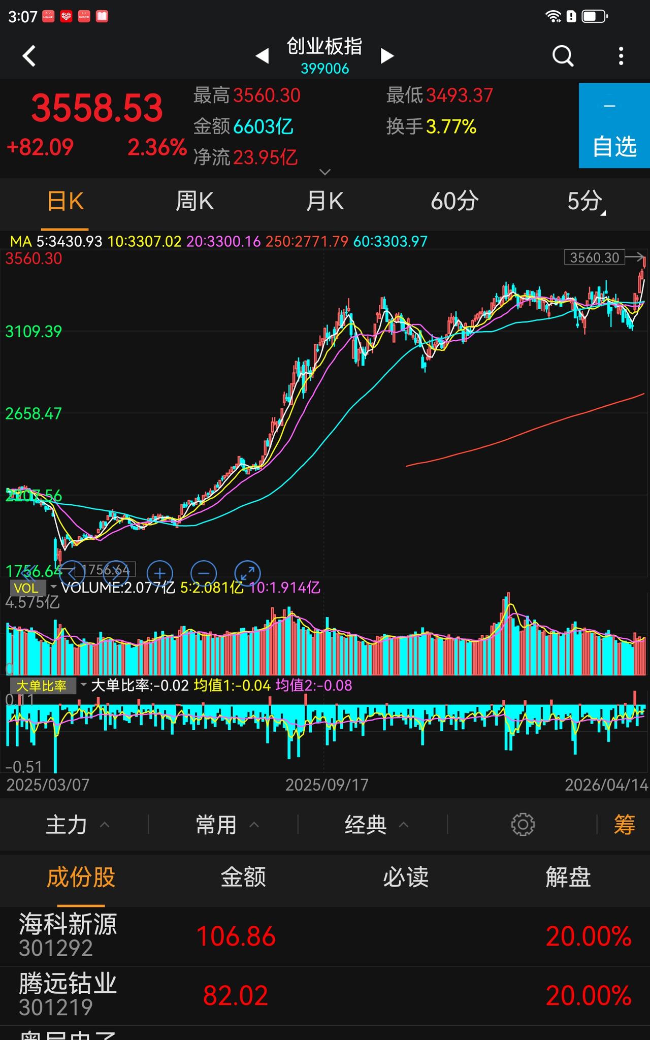 创业板指如入无人之地或者一骑绝尘,大A就是大A,当一些人还活在熊市吋,他早已进入了一个全新的时代,未来,他一定是伟大祖国强大的一个标志,我们的国防强大了,上市公司强大了,我们的总体国力强大了,我们的资本市场必然强大。