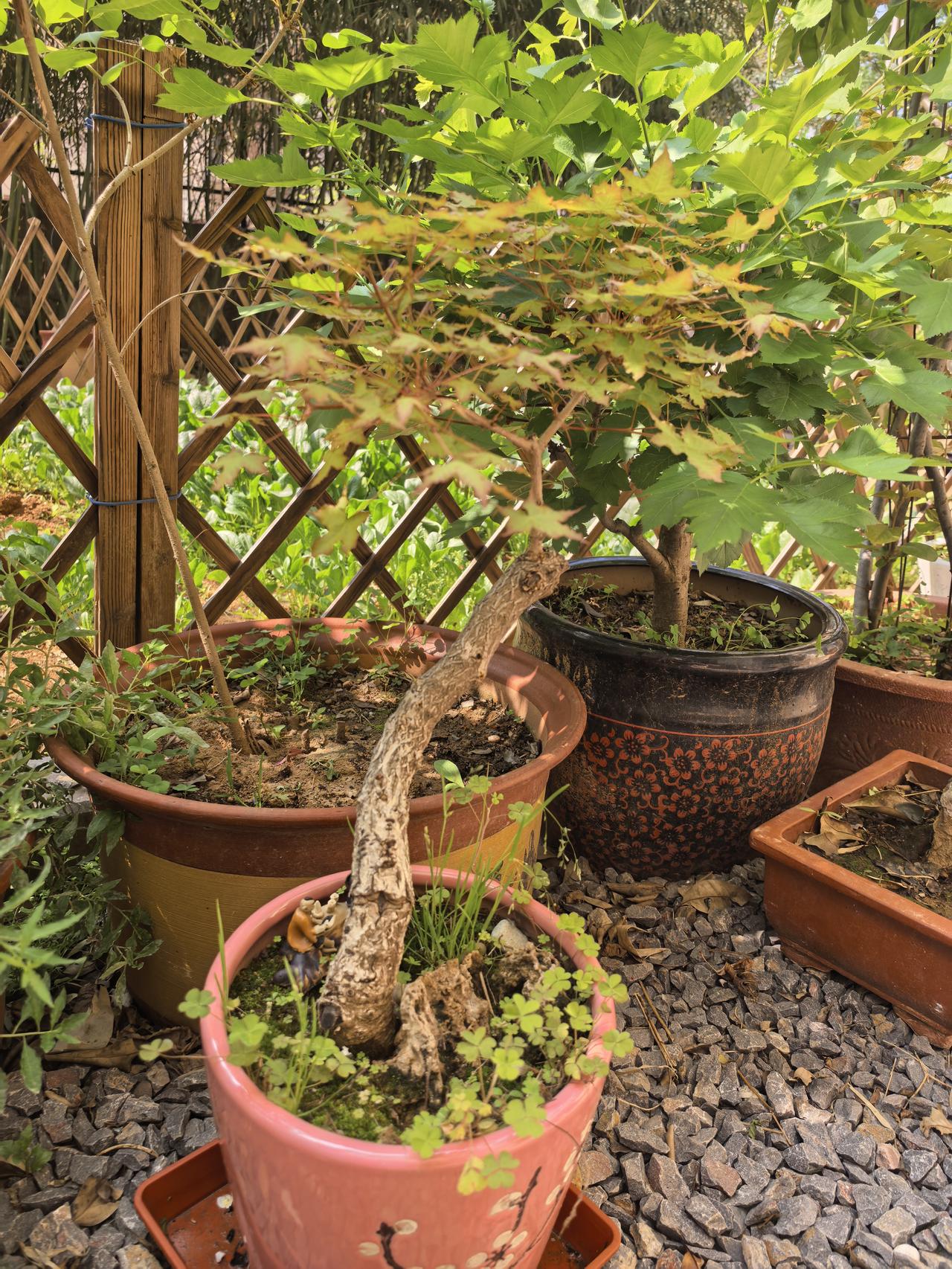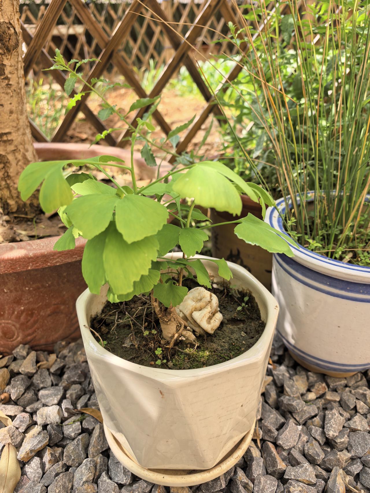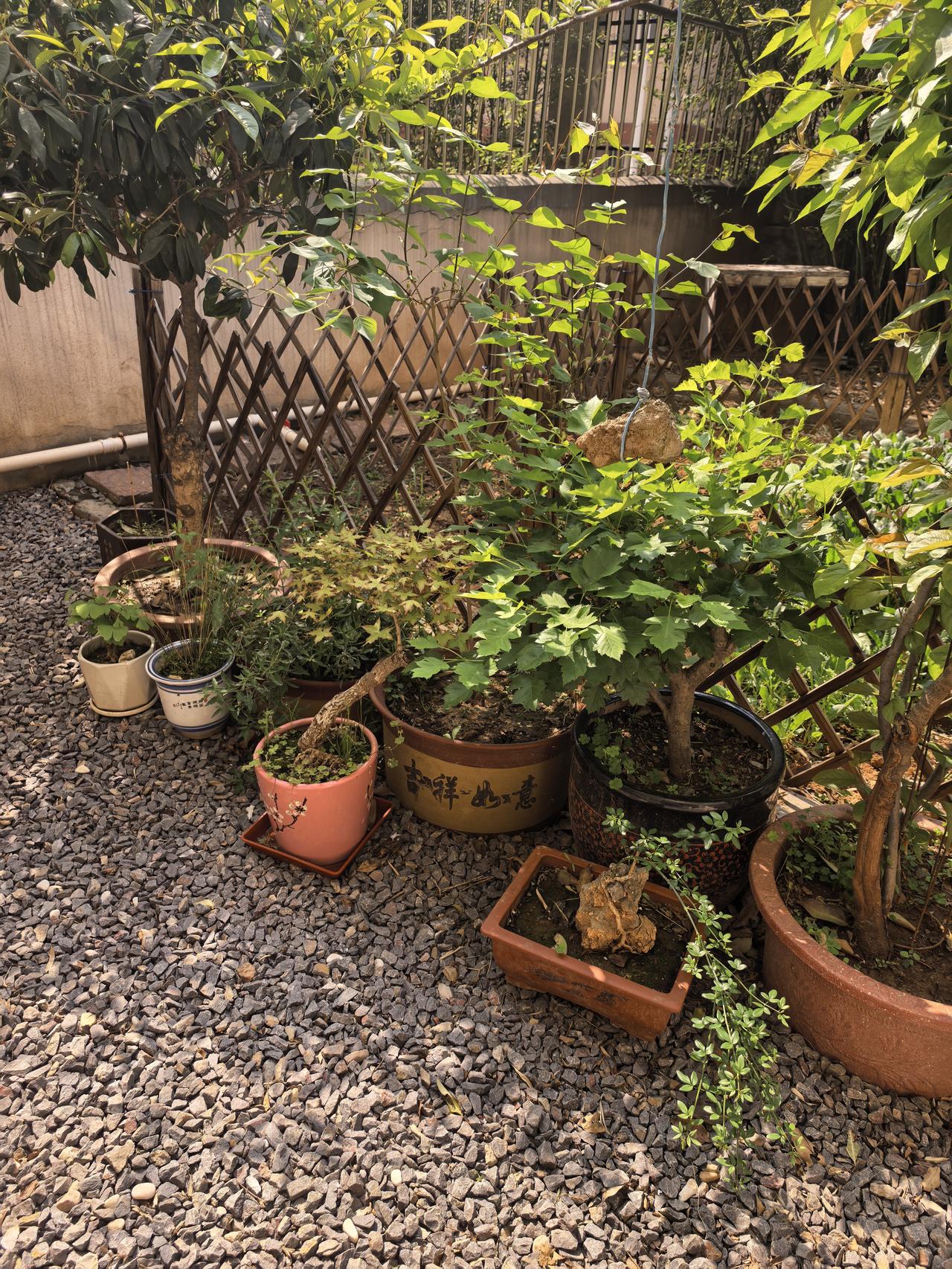 小院子里的小盆栽。银杏苗,灯心草,五角枫,迎春花,苹果树,山楂树,桂花树,丁香。