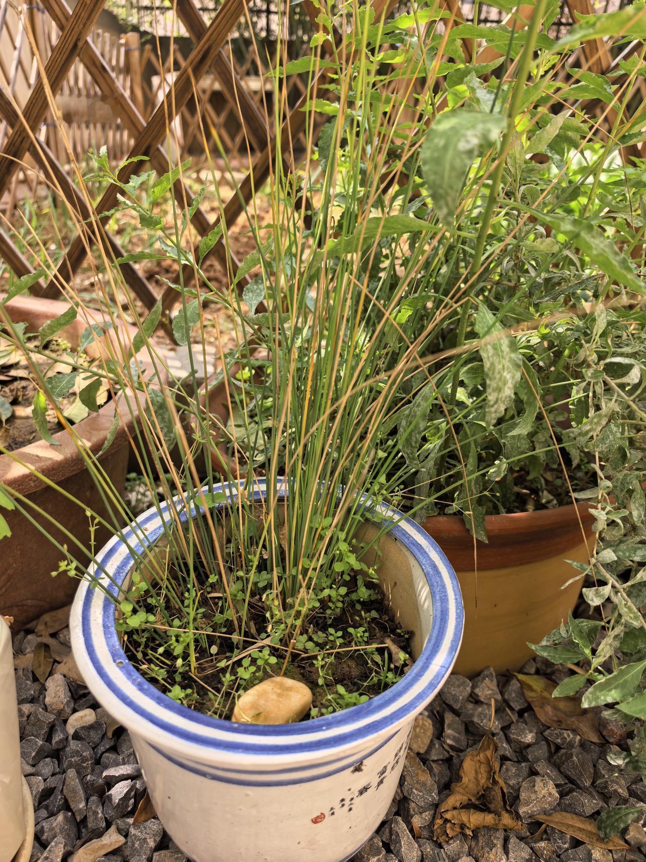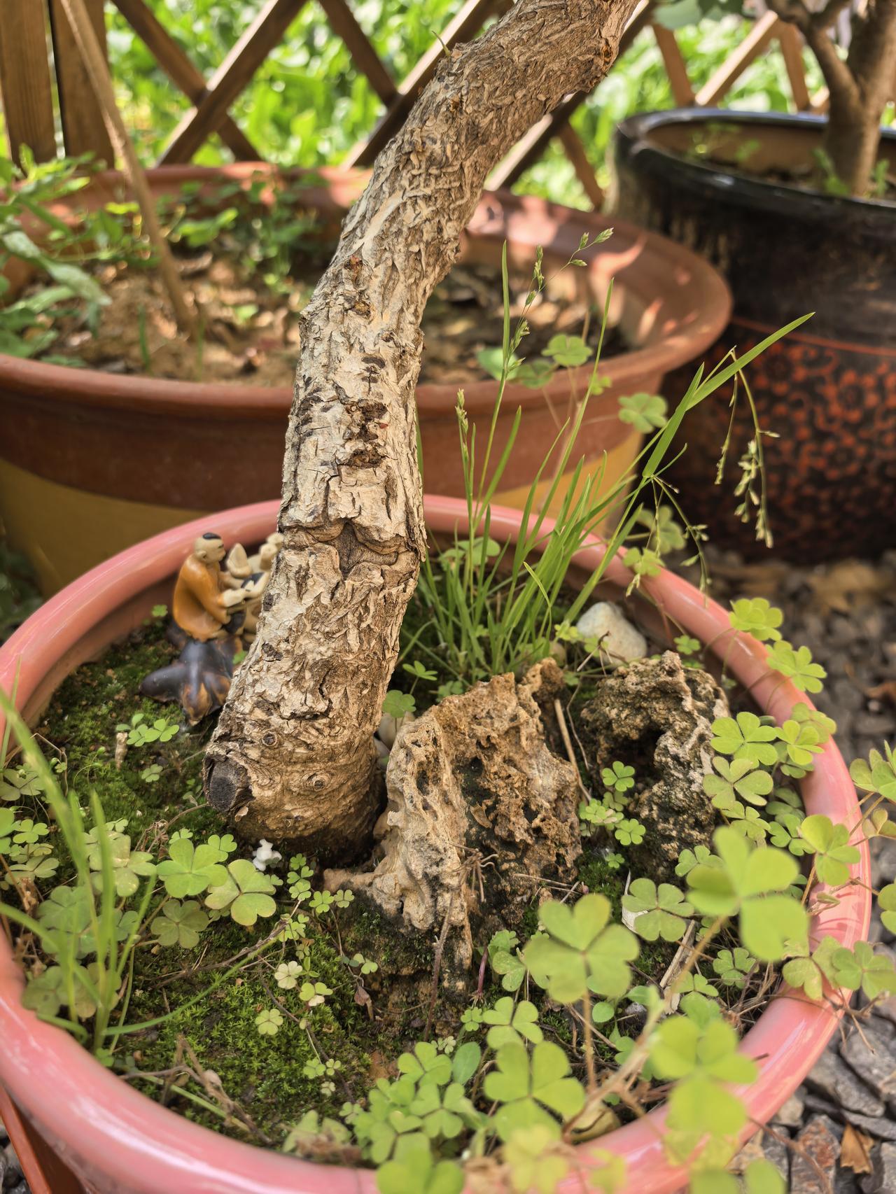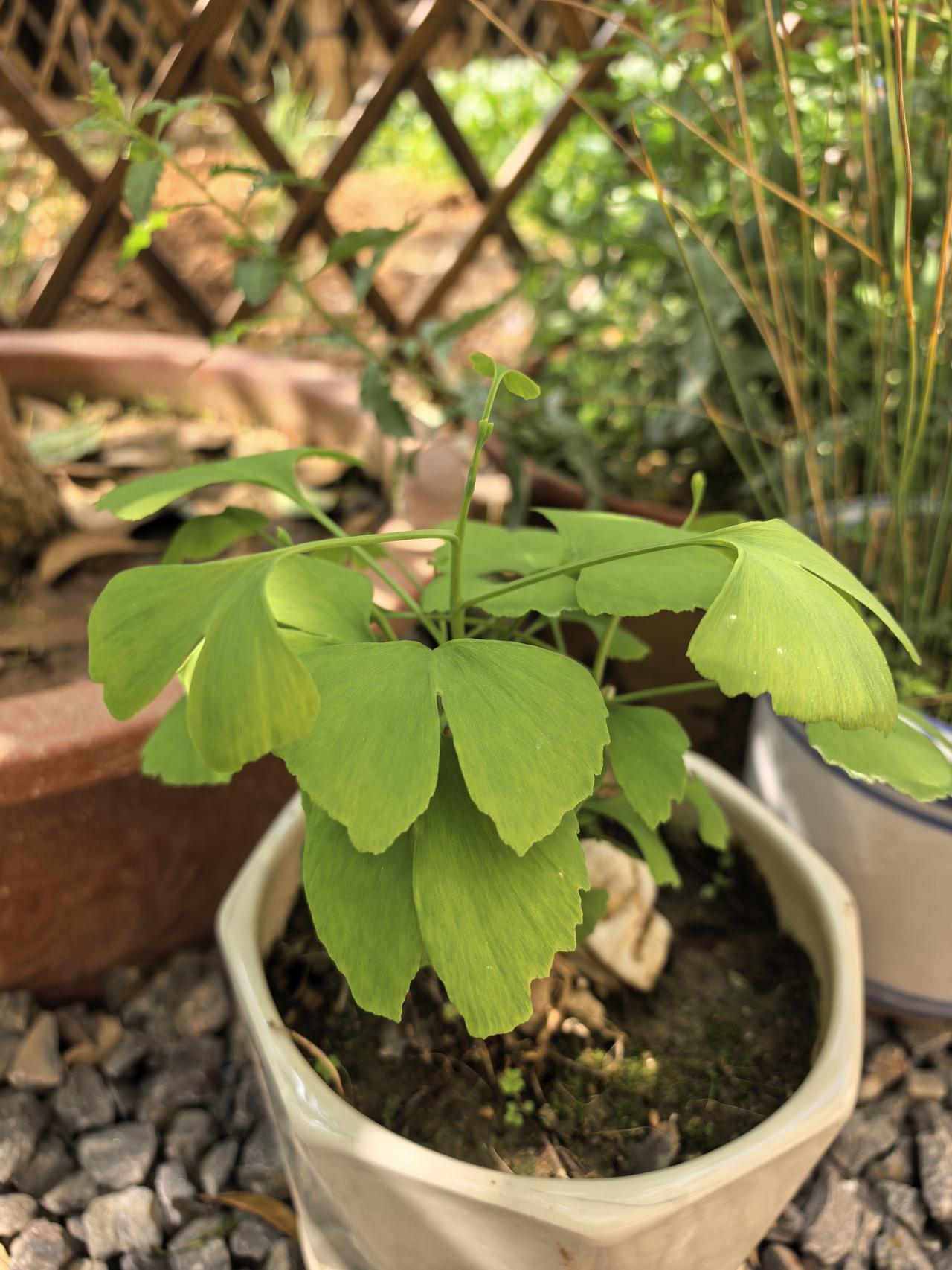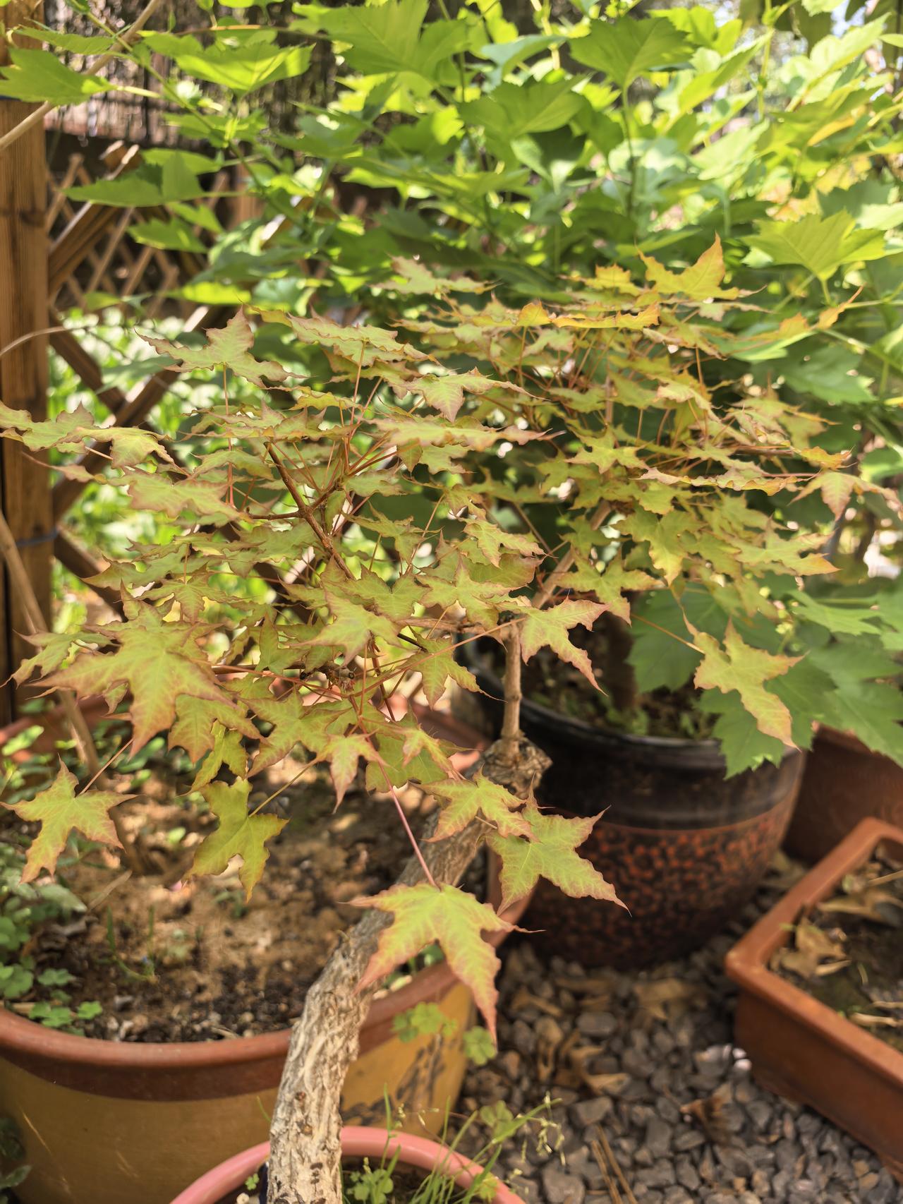 小院子里的小盆栽。银杏苗,灯心草,五角枫,迎春花,苹果树,山楂树,桂花树,丁香。