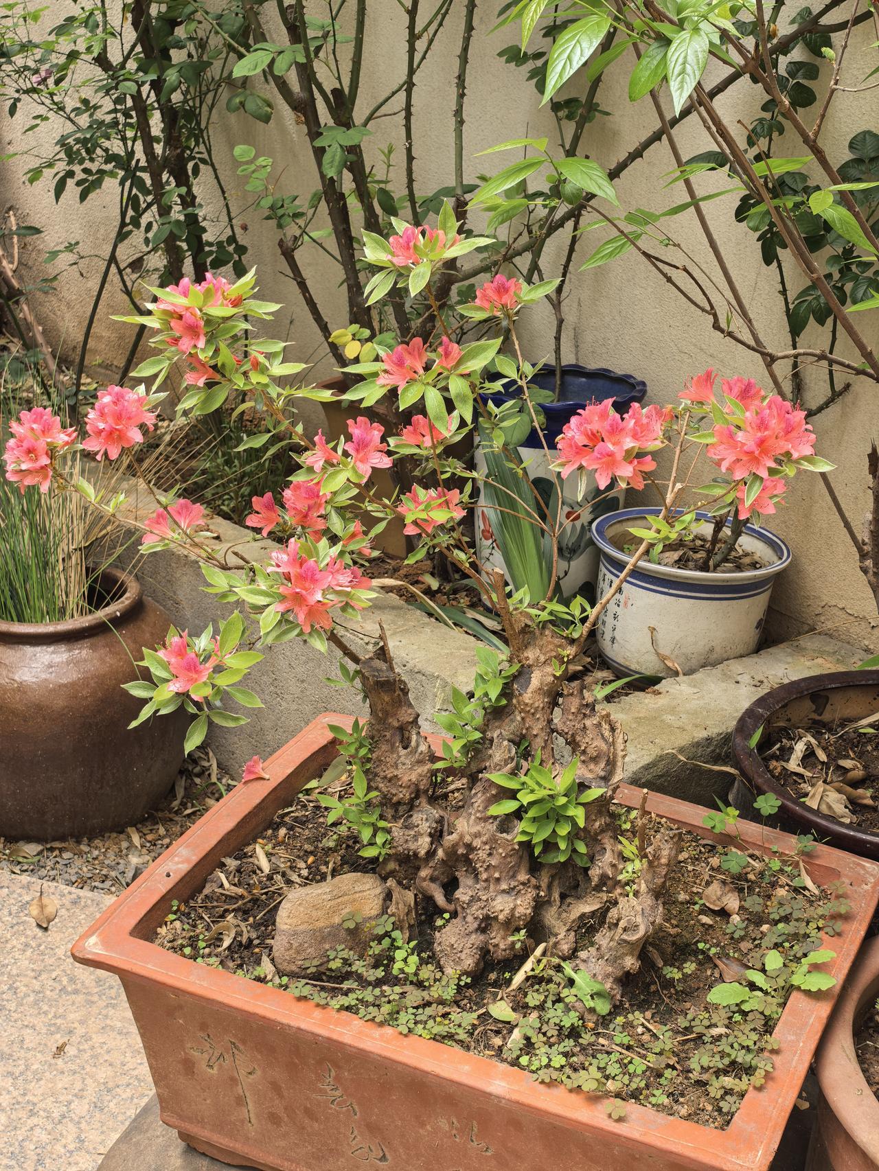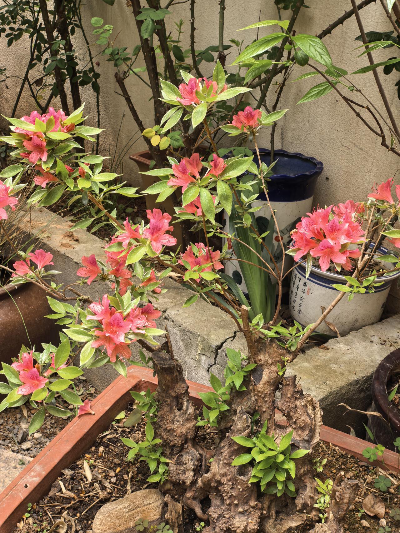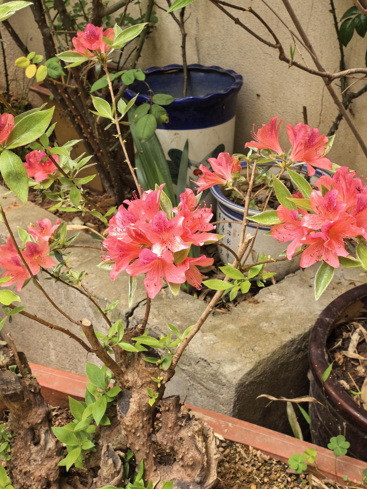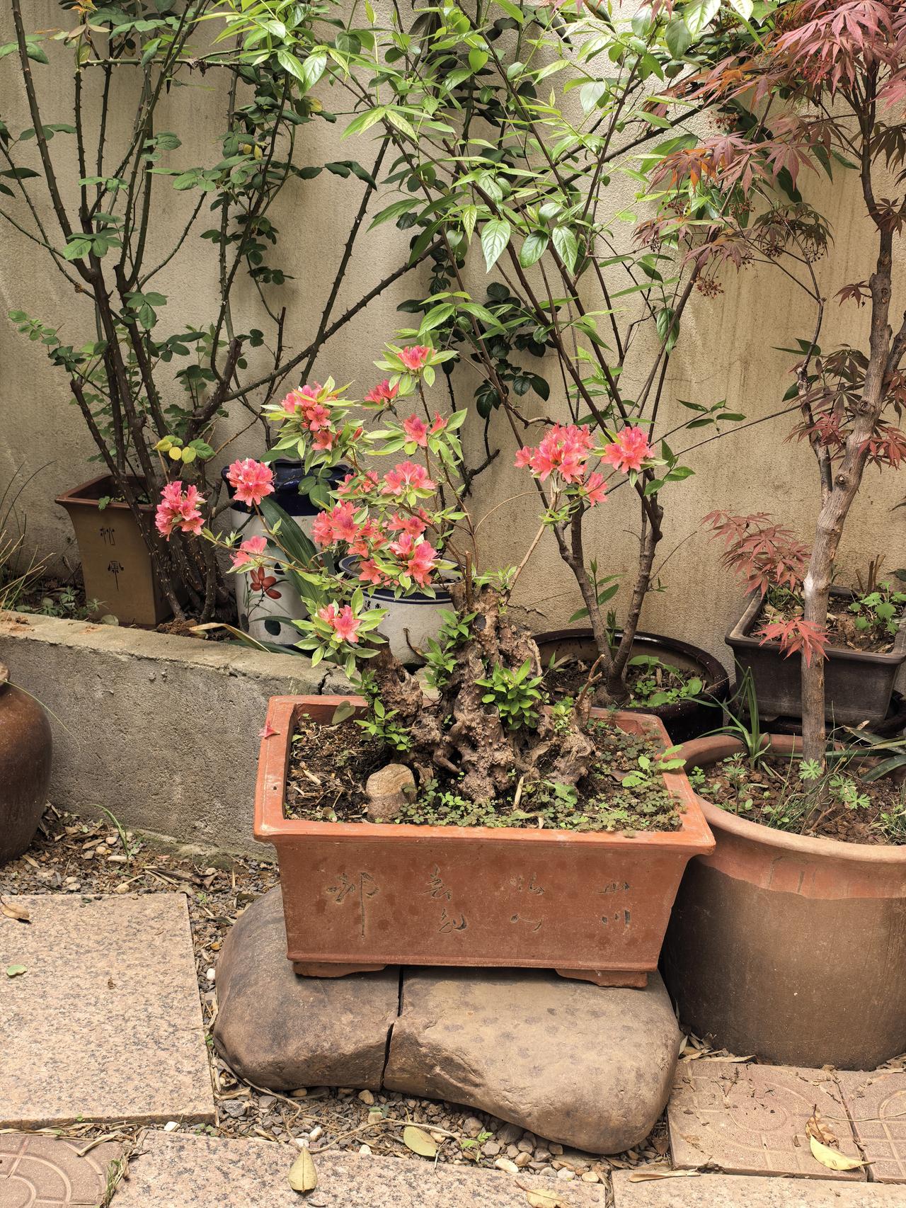 我家小院子里的盆景杜鹃花今年又开花了,粉红色的花朵一簇簇细细的花蕊非常漂亮,赏心