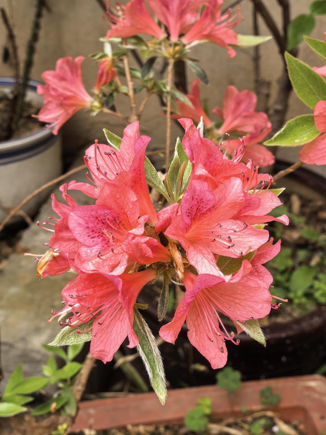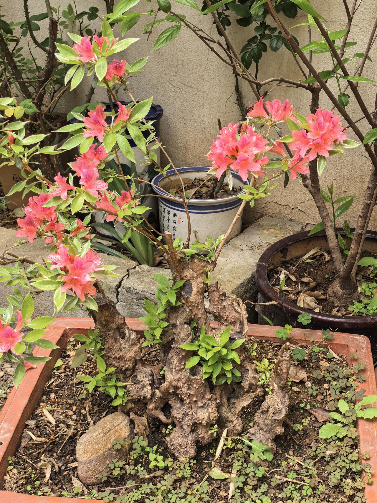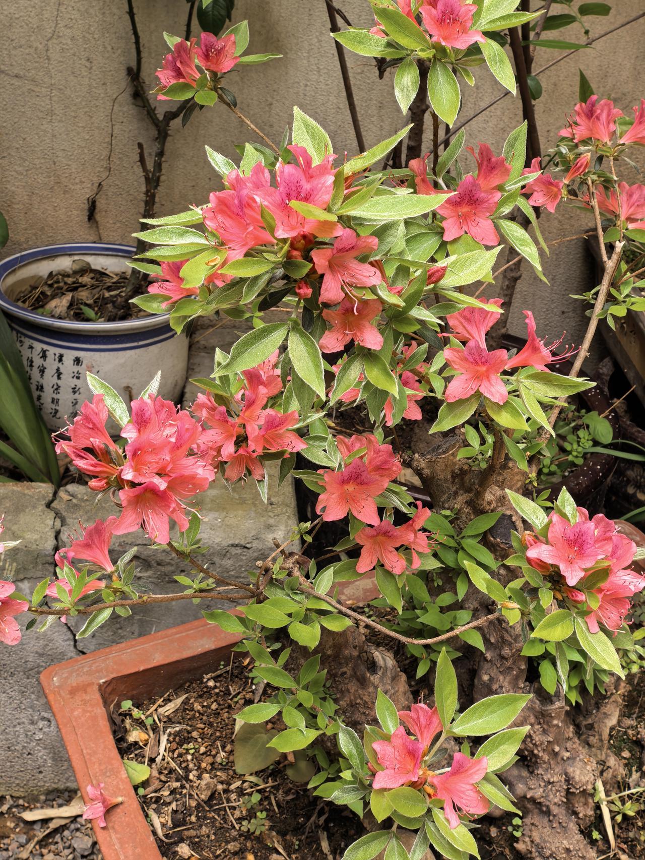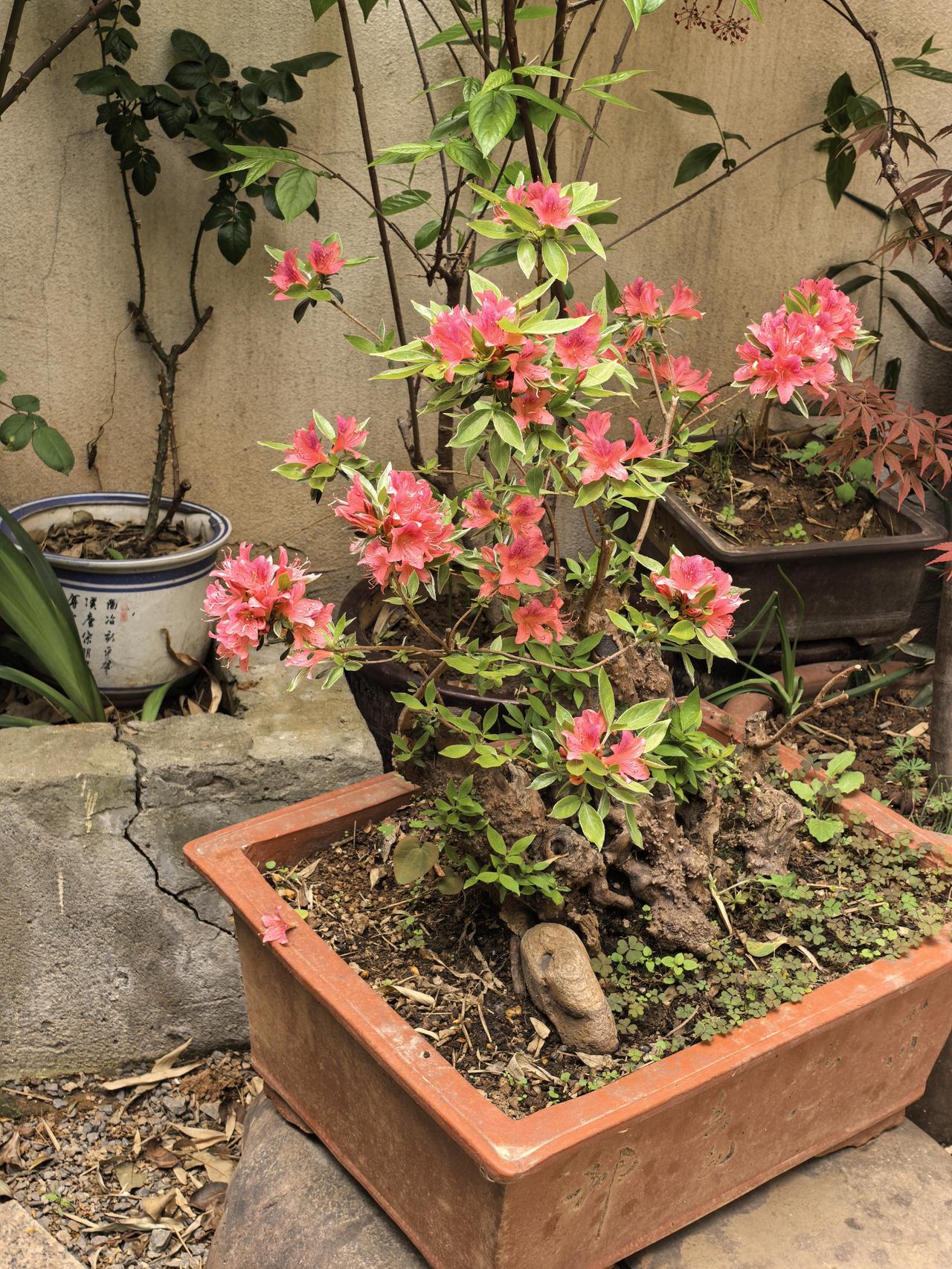 我家小院子里的盆景杜鹃花今年又开花了,粉红色的花朵一簇簇细细的花蕊非常漂亮,赏心