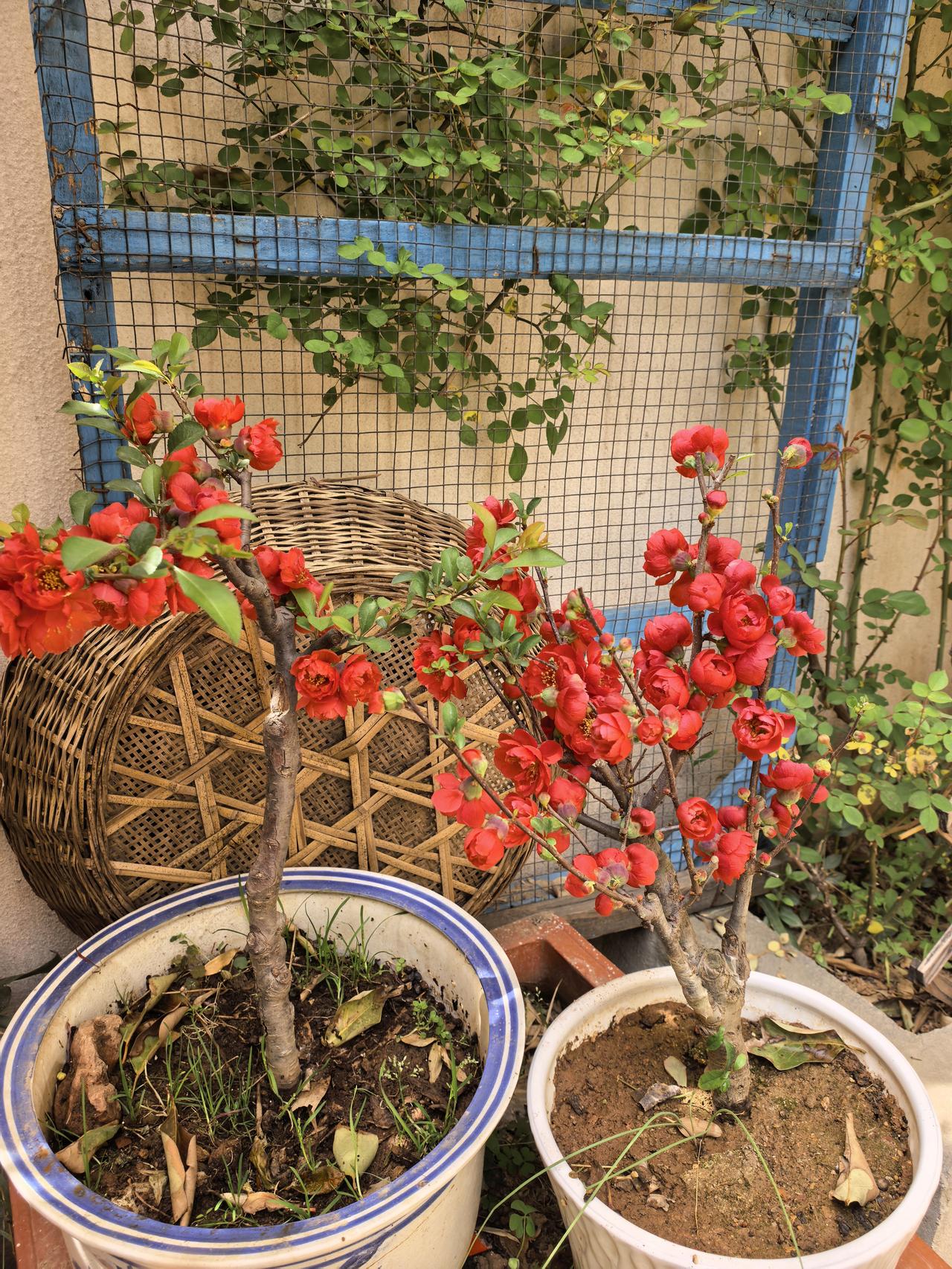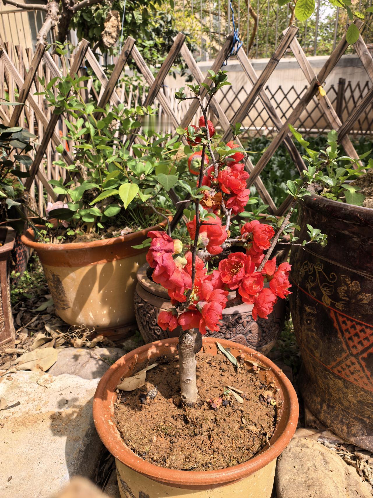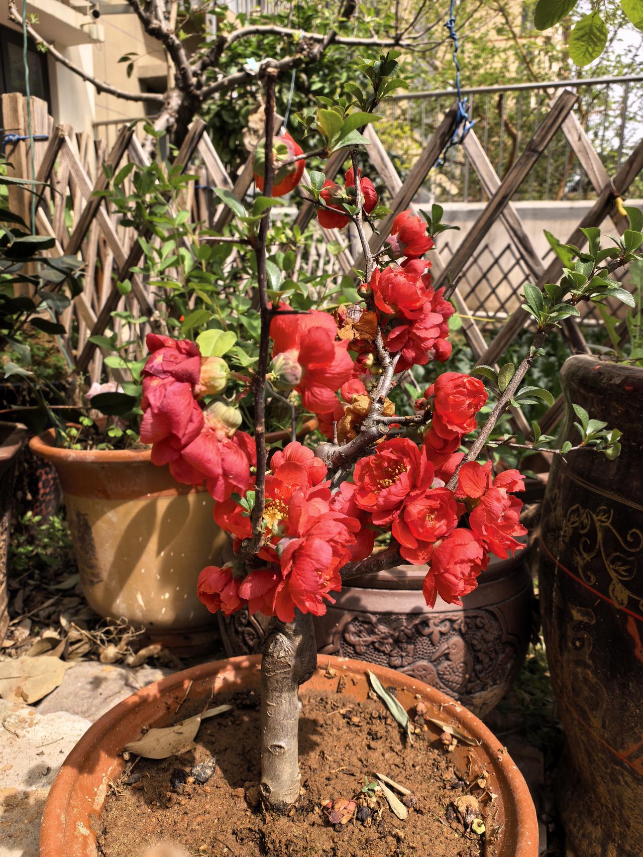 我家小院里的三盆海棠花。三盆贴梗海棠,春节后冬天就起了花苞,直到现在才盛开,不过红艳艳的花朵开的很浓烈!