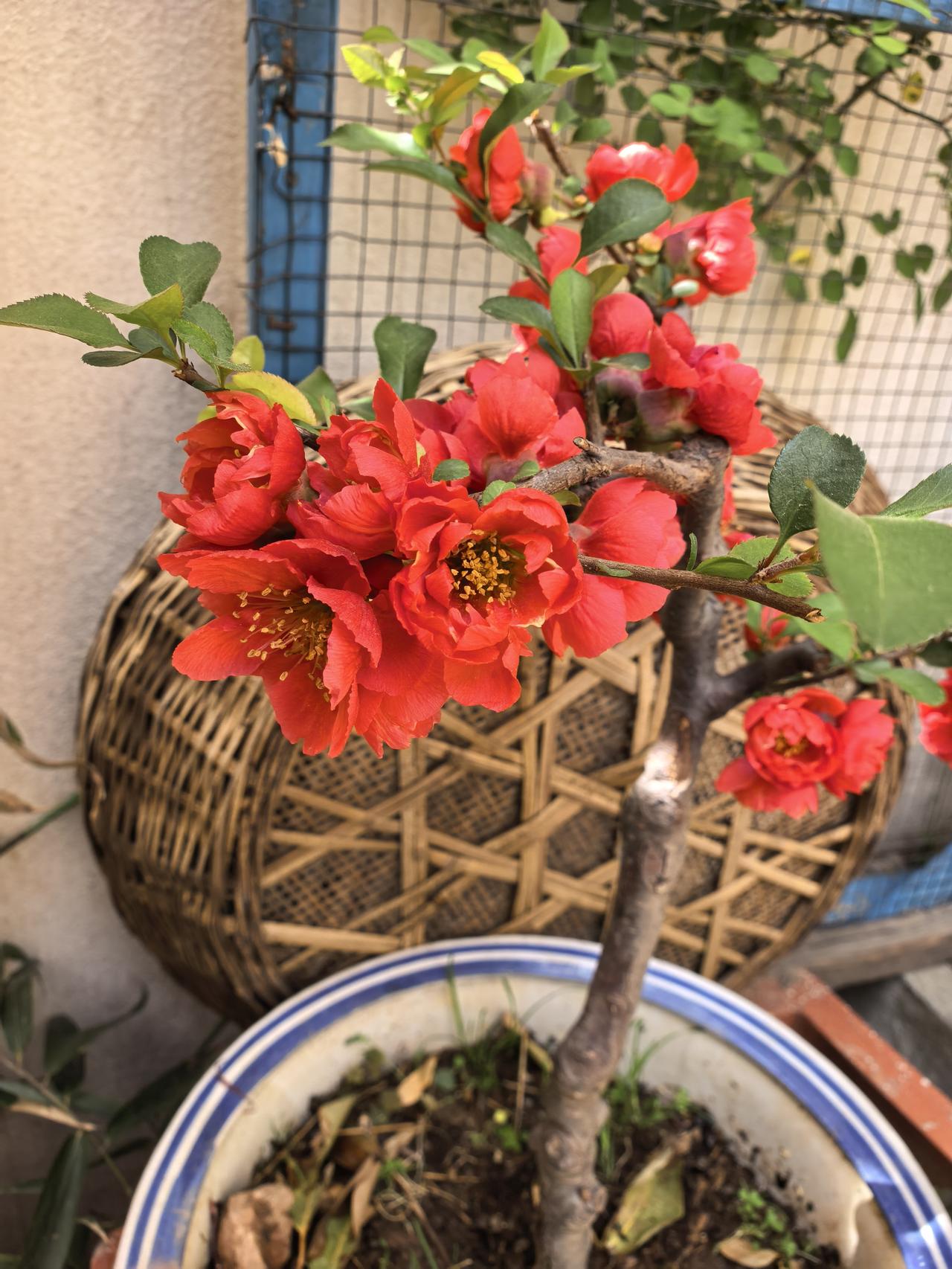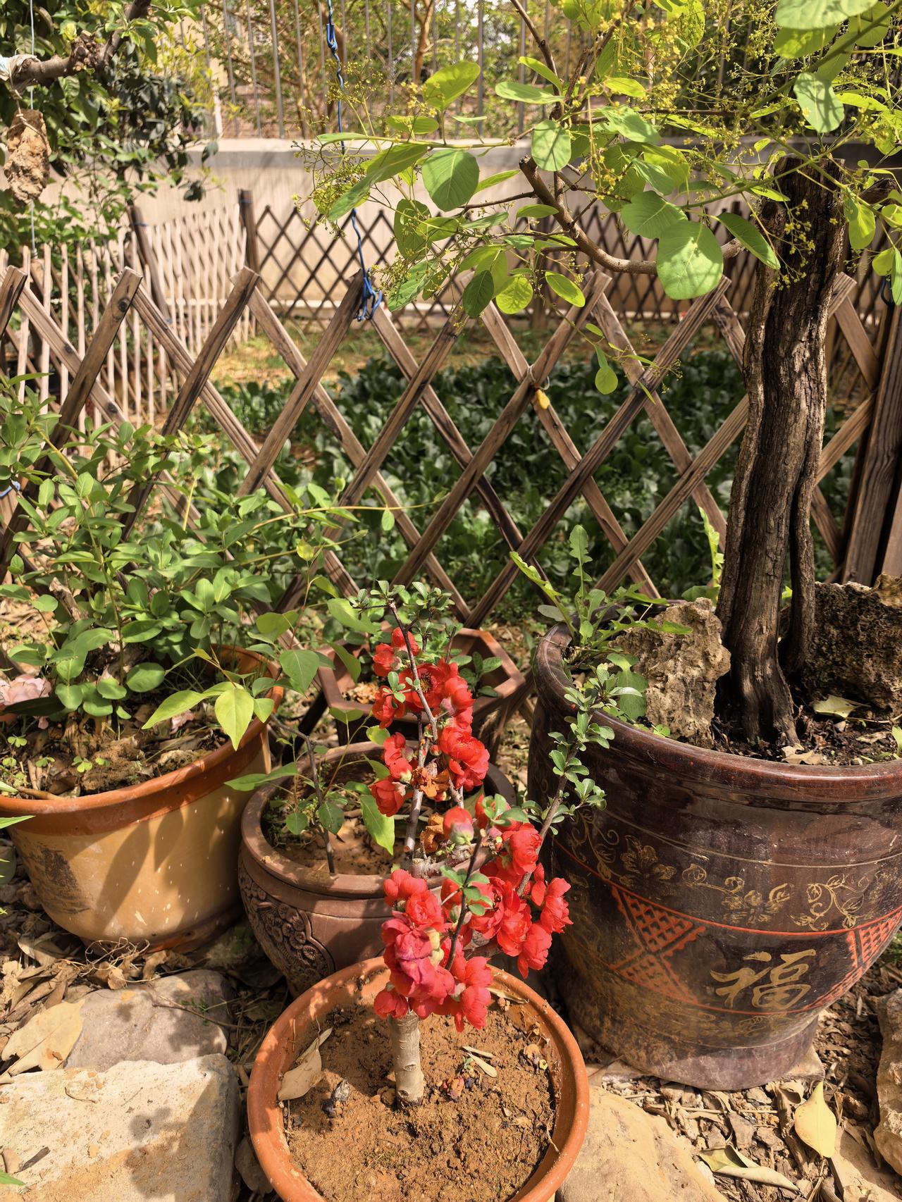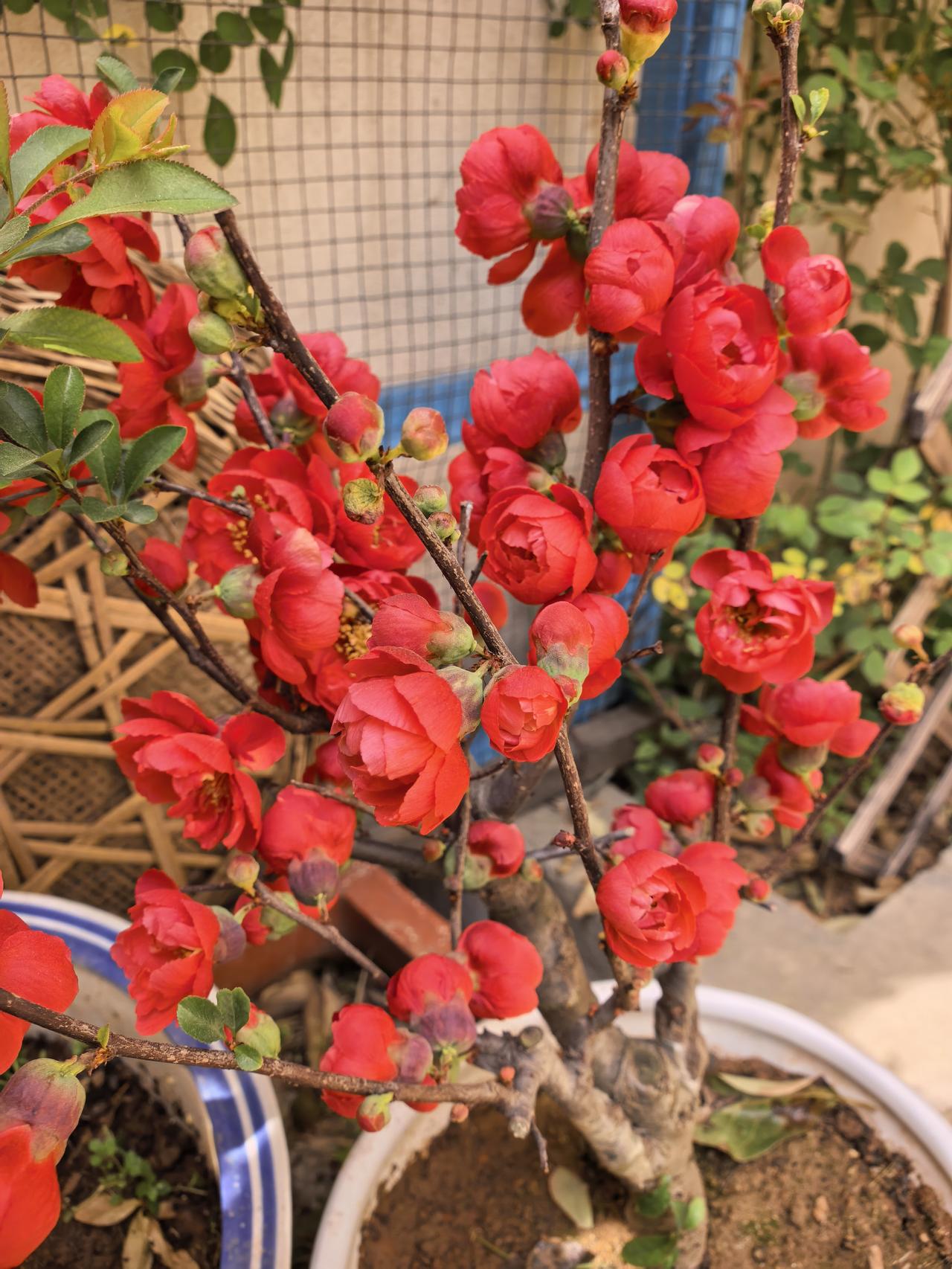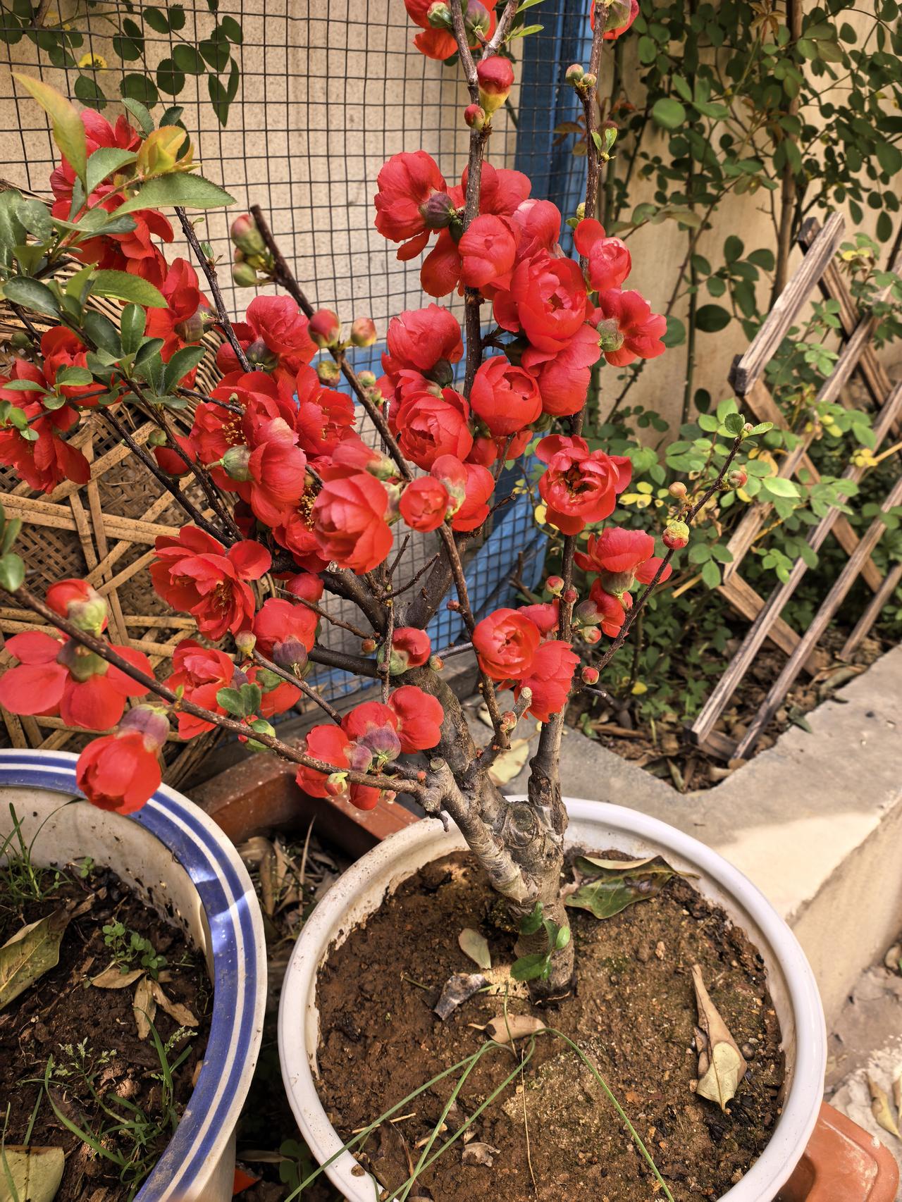 我家小院里的三盆海棠花。三盆贴梗海棠,春节后冬天就起了花苞,直到现在才盛开,不过红艳艳的花朵开的很浓烈!