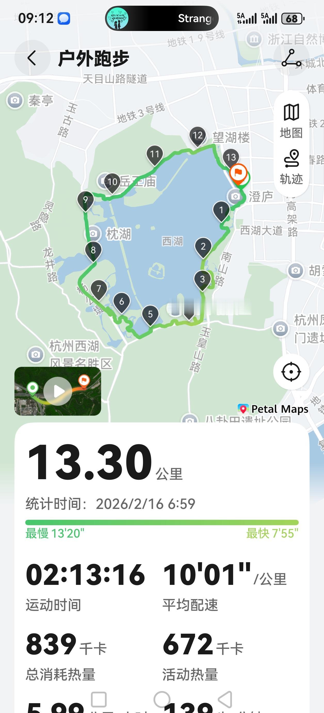 自驾1000公里到顺利到达杭州。早上细雨中绕西湖慢跑一圈,气温6度,一整圈13.3公里,慢跑8公里快走5公里。