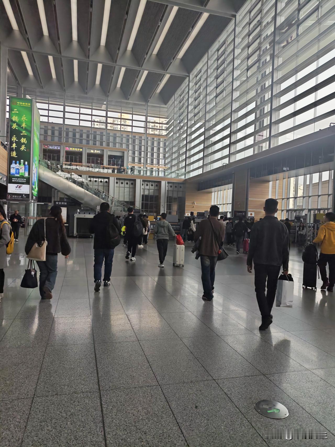 去乘坐火车的人们,站在扶梯上,低头看手机,由着扶梯一点点往上走。到了安检入口,人们步行的速度都有所加快了。