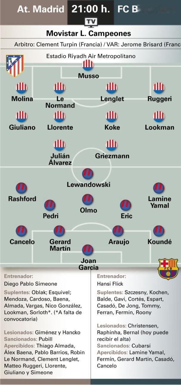 媒体预测巴萨VS马德里竞技比赛首发阵容,多人面临黄牌停赛风险。欧冠联赛马竞vs巴