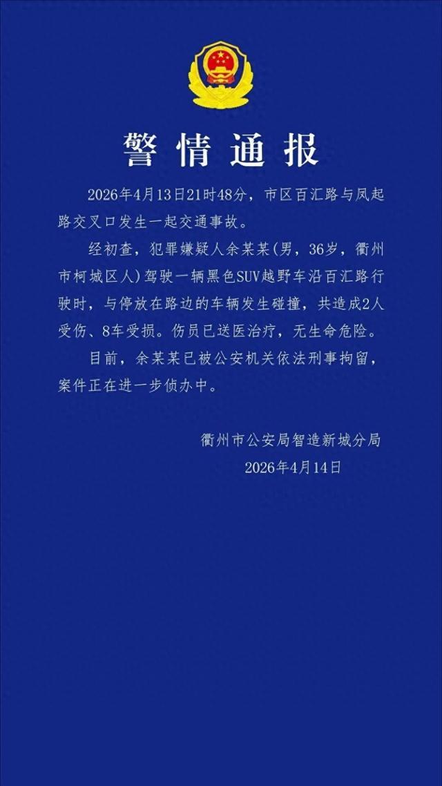 经初查,犯罪嫌疑人余某某(男,36岁,衢州市柯城区人)驾驶一辆黑色SUV越野车沿百汇路行驶时,与停放在路边的车辆发生碰撞,共造成2人受伤、8车受损。伤员已送医治疗,无生命危险。
