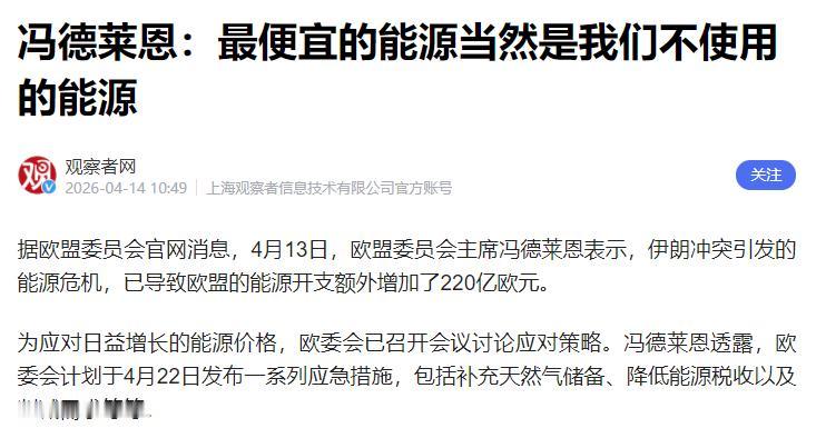 4月13日,欧盟主席冯德莱恩说了句大实话:“最便宜的能源,就是我们不使用的能源。”说白了就是,少用点能源,就能少花点钱。