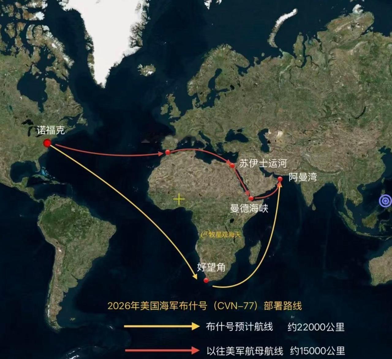 因为,布什号从美国出发赶往中东,选了一条最远的路,绕道好望角,迂回上去。