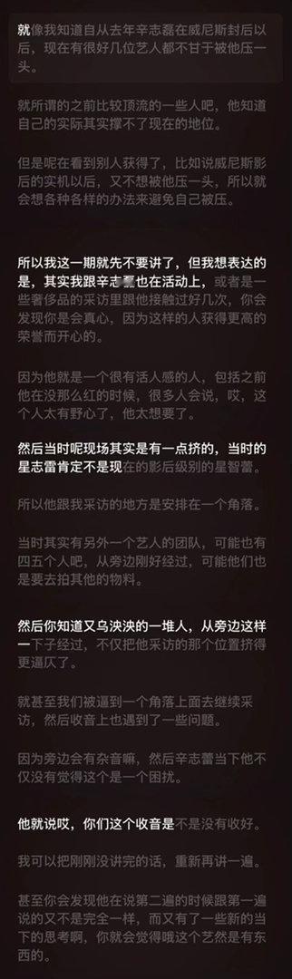曝好几位艺人不甘被辛芷蕾压一头克里森是业内,很多艺人接受过他的采访,而且这篇播客里讲了很多时尚圈的内容,辛芷蕾这个只占了几分钟,克里森后面还夸了辛芷蕾人品好、有魅力,之前没红的时候克里森采访辛芷蕾第一遍收音不好,辛芷蕾主动要求再采一遍,每个和辛芷蕾接触过的人都是夸她的