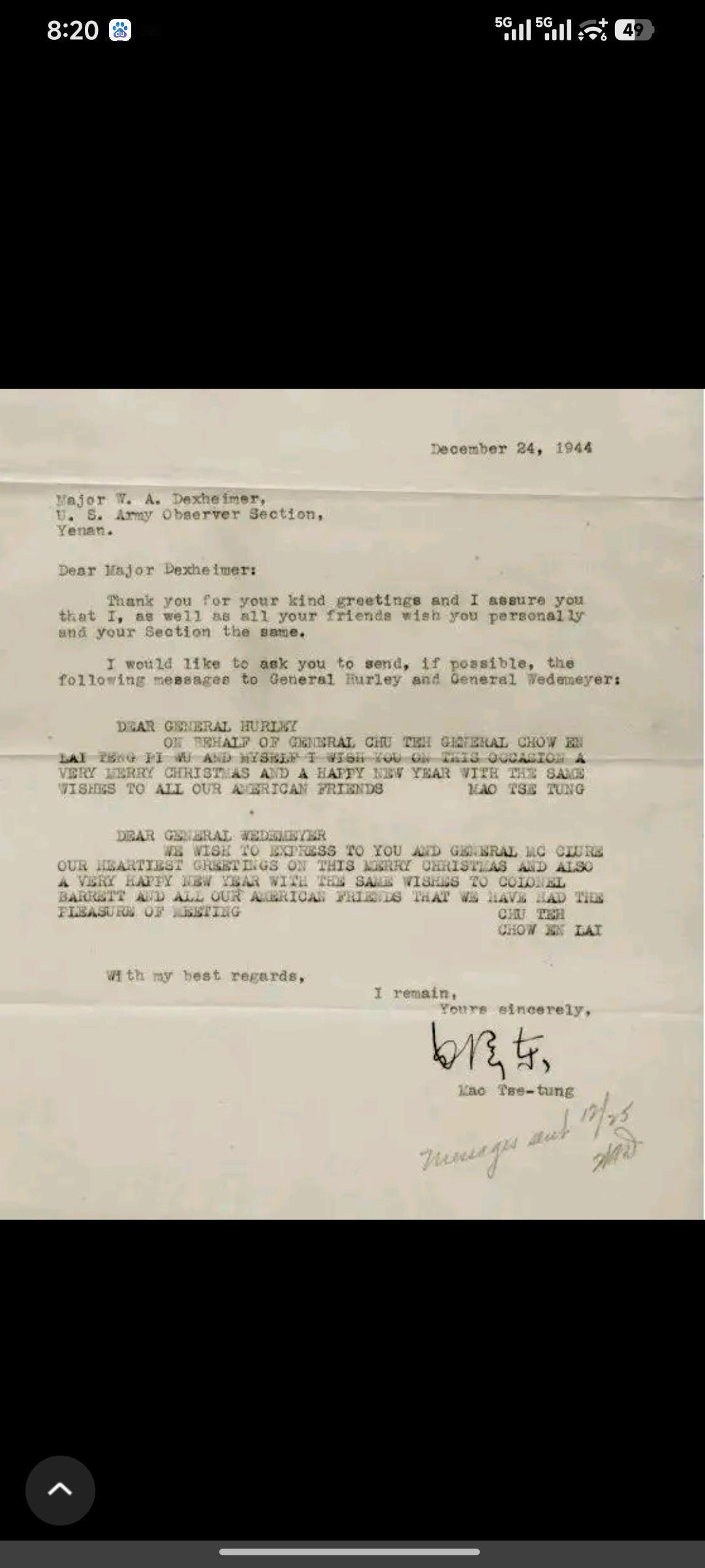 毛主席致信美军观察团少校戴斯汉姆的感谢信,字字值千金!