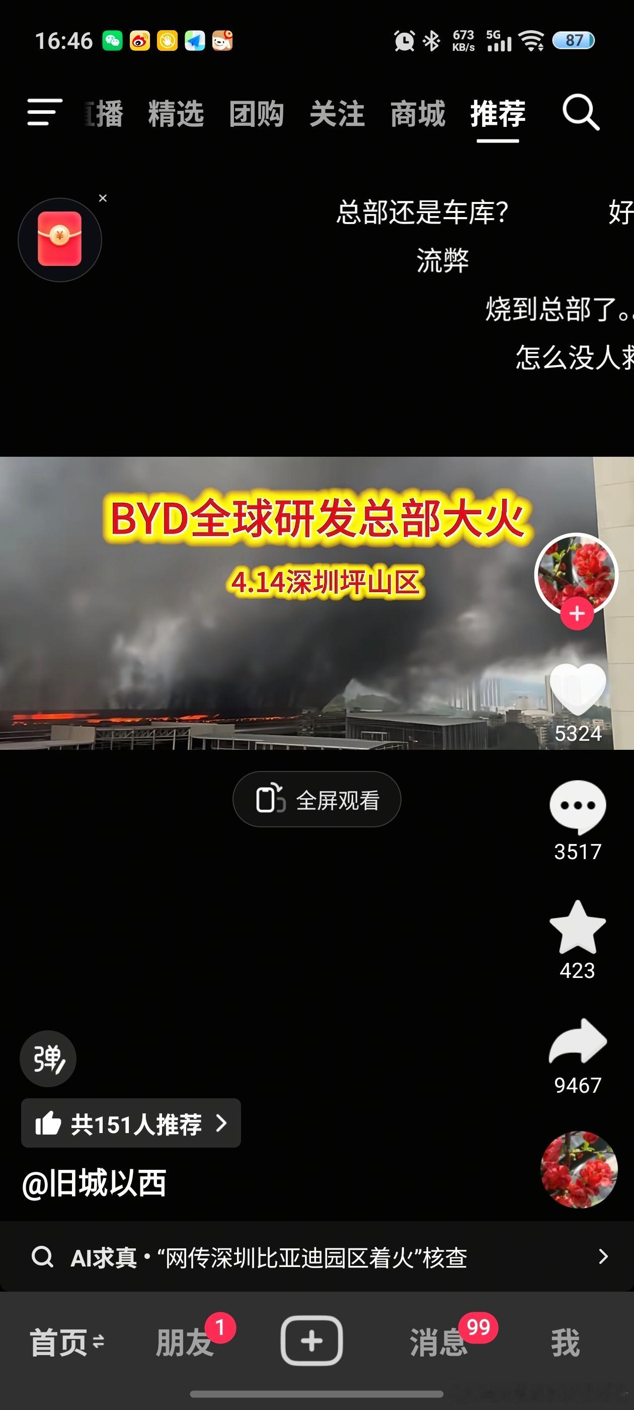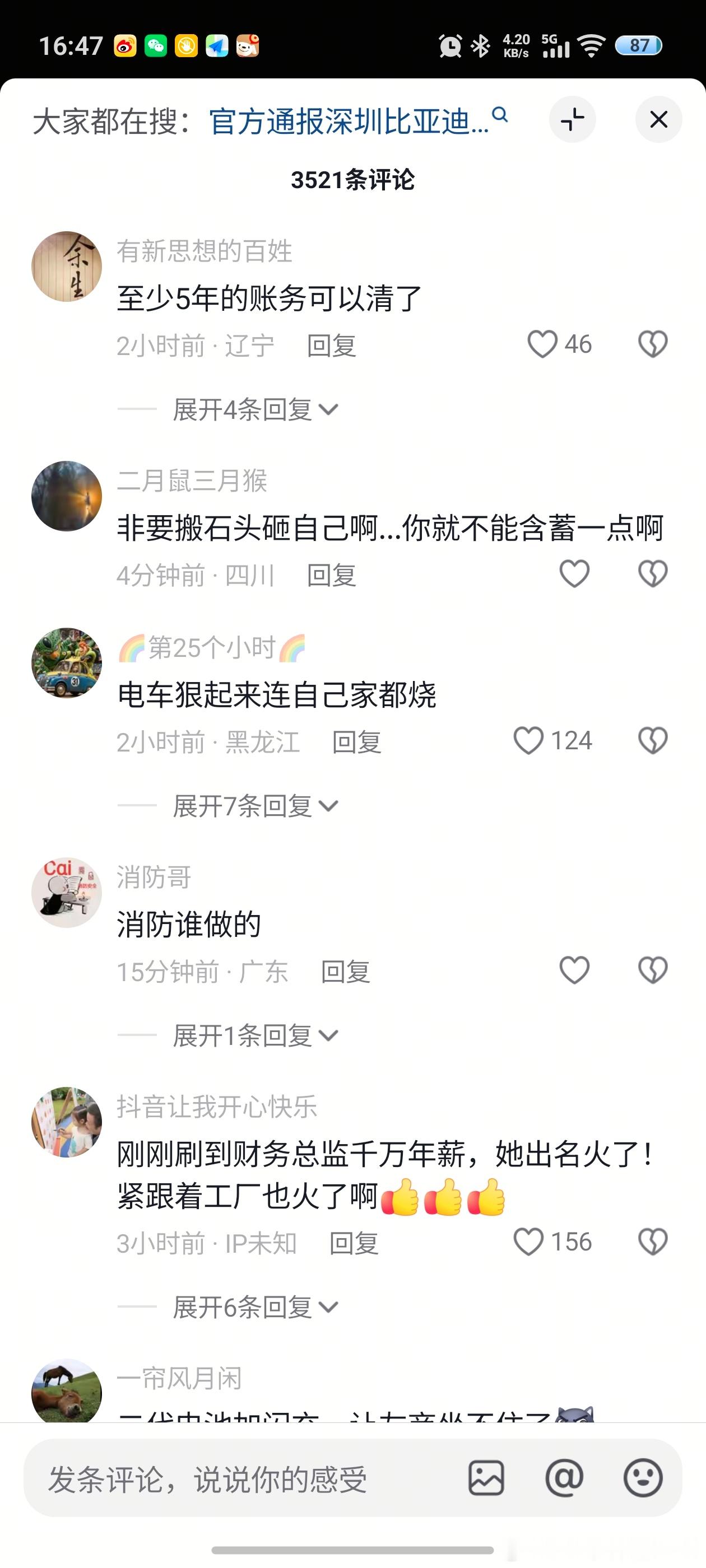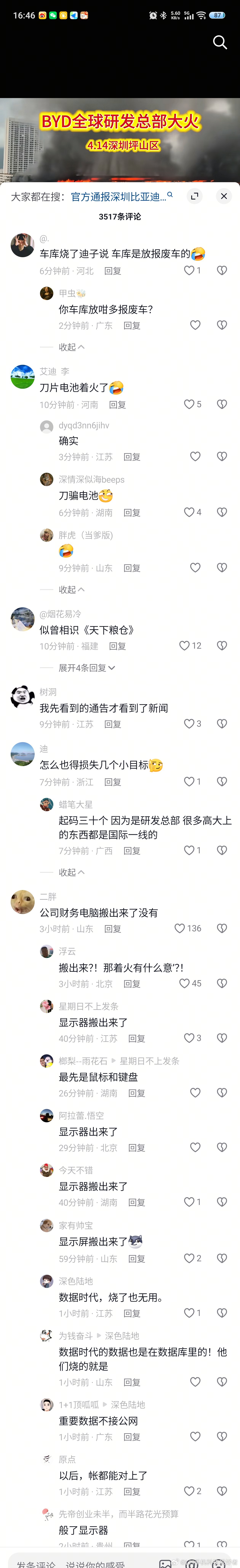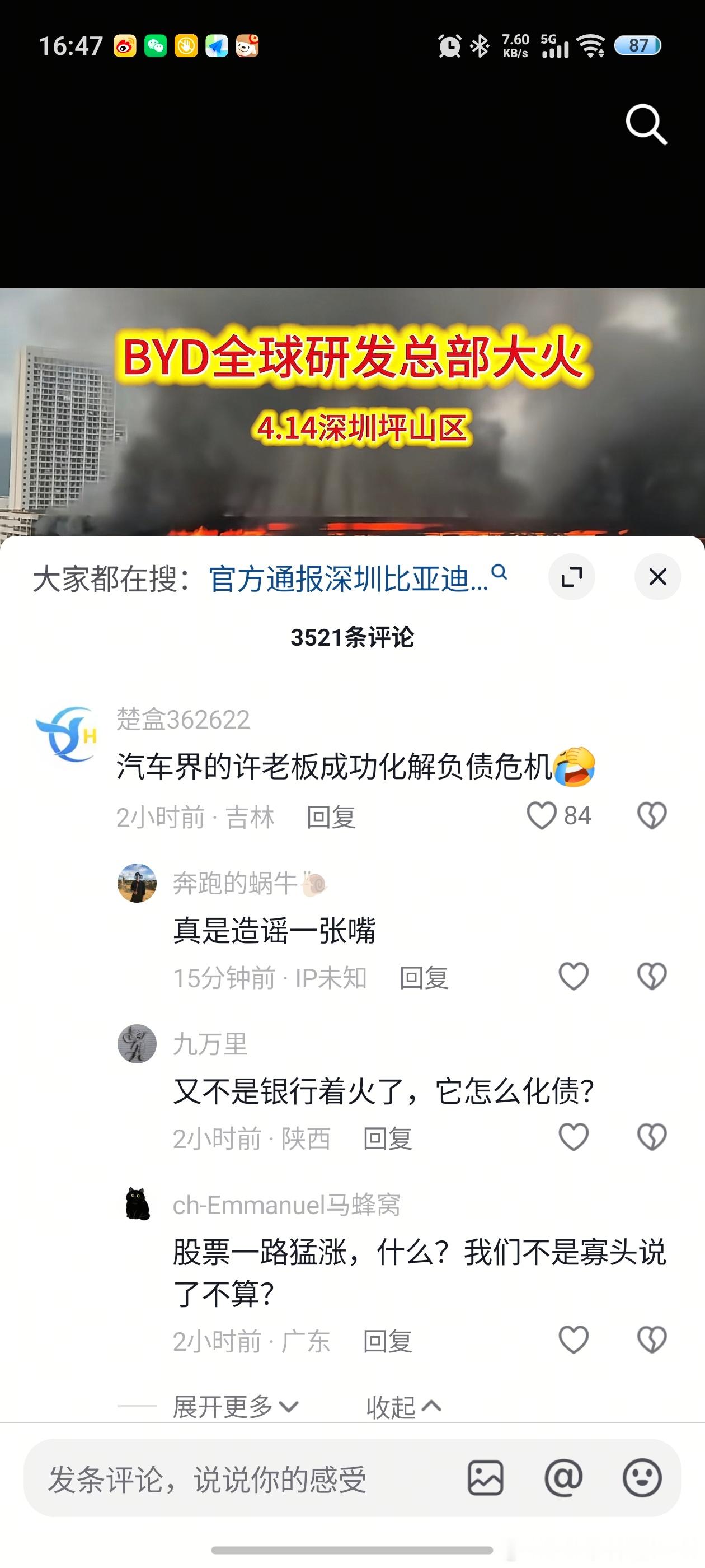 我看了一圈,依然有很多在乱带节奏的。平常没流量的小博主,这次发着火视频,并配文比亚迪全球研发总部大火,流量却蹭蹭的涨。5000多个点赞,3000多个评论在煽风点火带节奏,却很少有人去关注回应。
