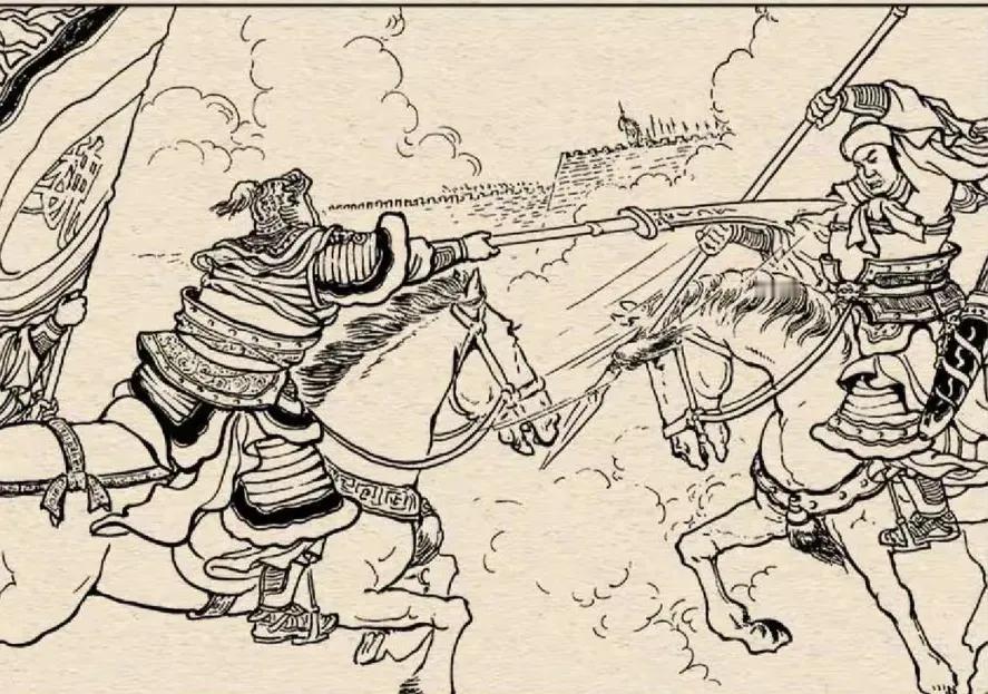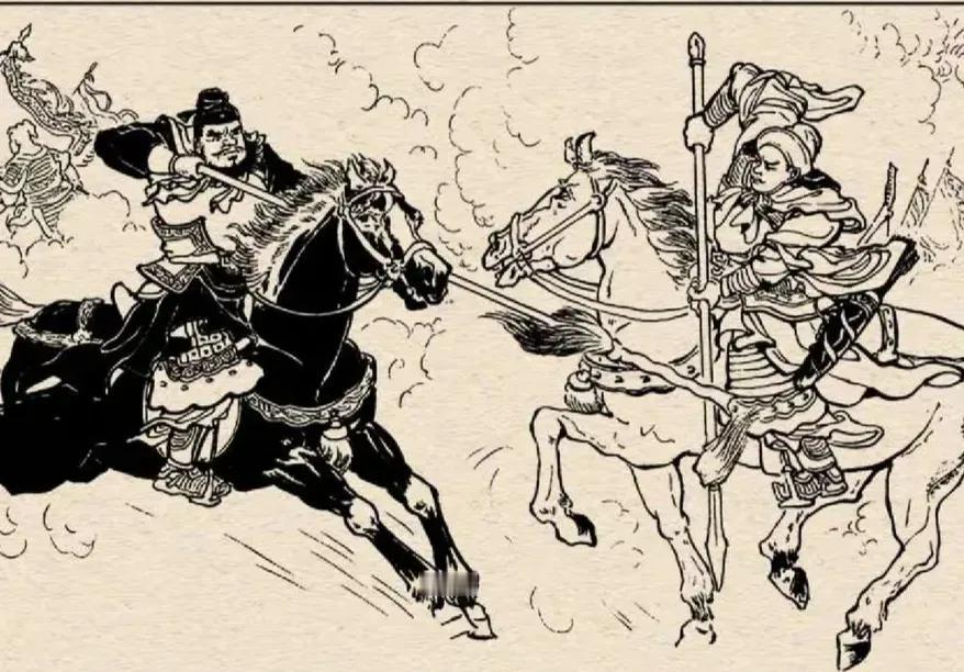 这次他与一使刀的大将交手十几合后,那大将诈败而跑。