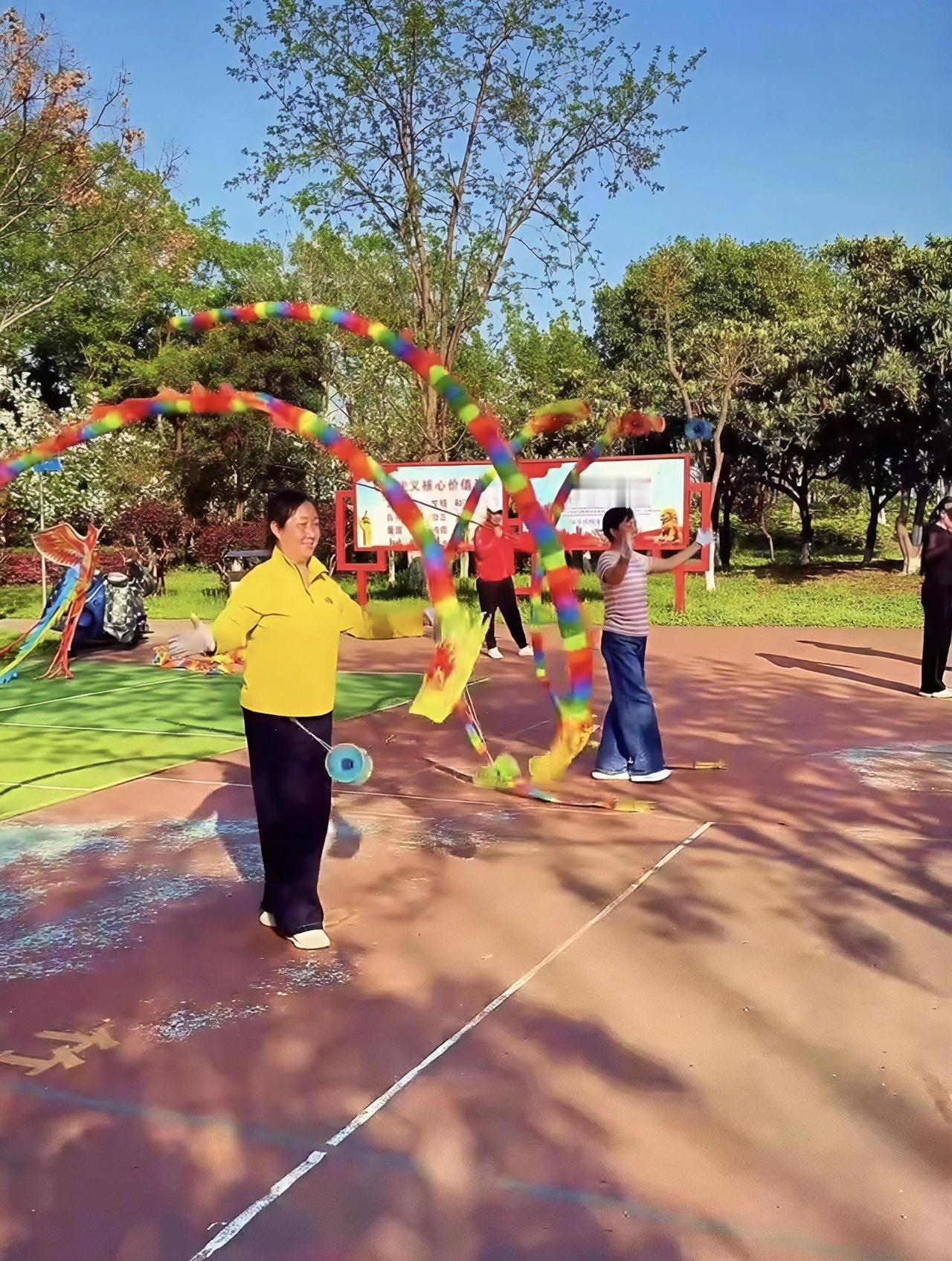 早上七点多,梅城公园的空地上,我远远看见一群人围成圈,中间传来"嗡嗡"的声响——走近一看,竟是几位六七十岁的老人在玩空竹!