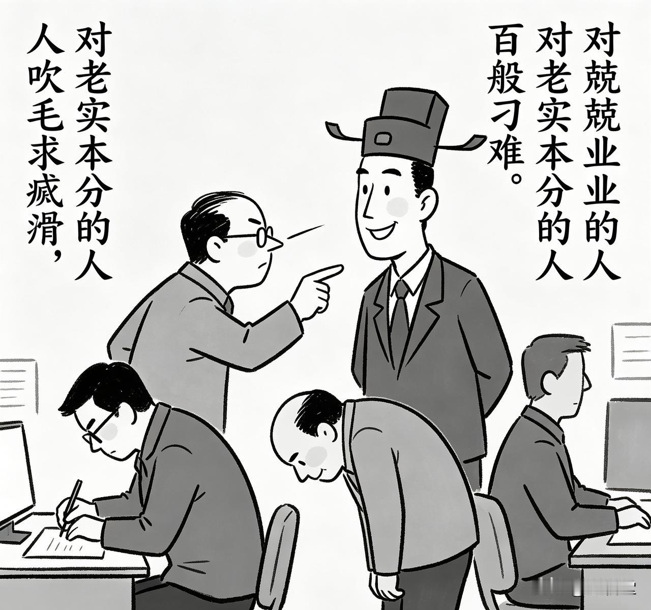 对兢兢业业干活的人,他们鸡蛋里挑骨头,吹毛求疵;对老实本分的人,他们各种挑剔,百般刁难;对阿谀奉承的人,他们却赞不绝口,夸个没完;对偷奸耍滑的人,他们睁一只眼闭一只眼,得过且过;对拉帮结派的人,他们装作没看见,视若无睹;对埋头苦干的人,他们毫不在意,满不在乎。