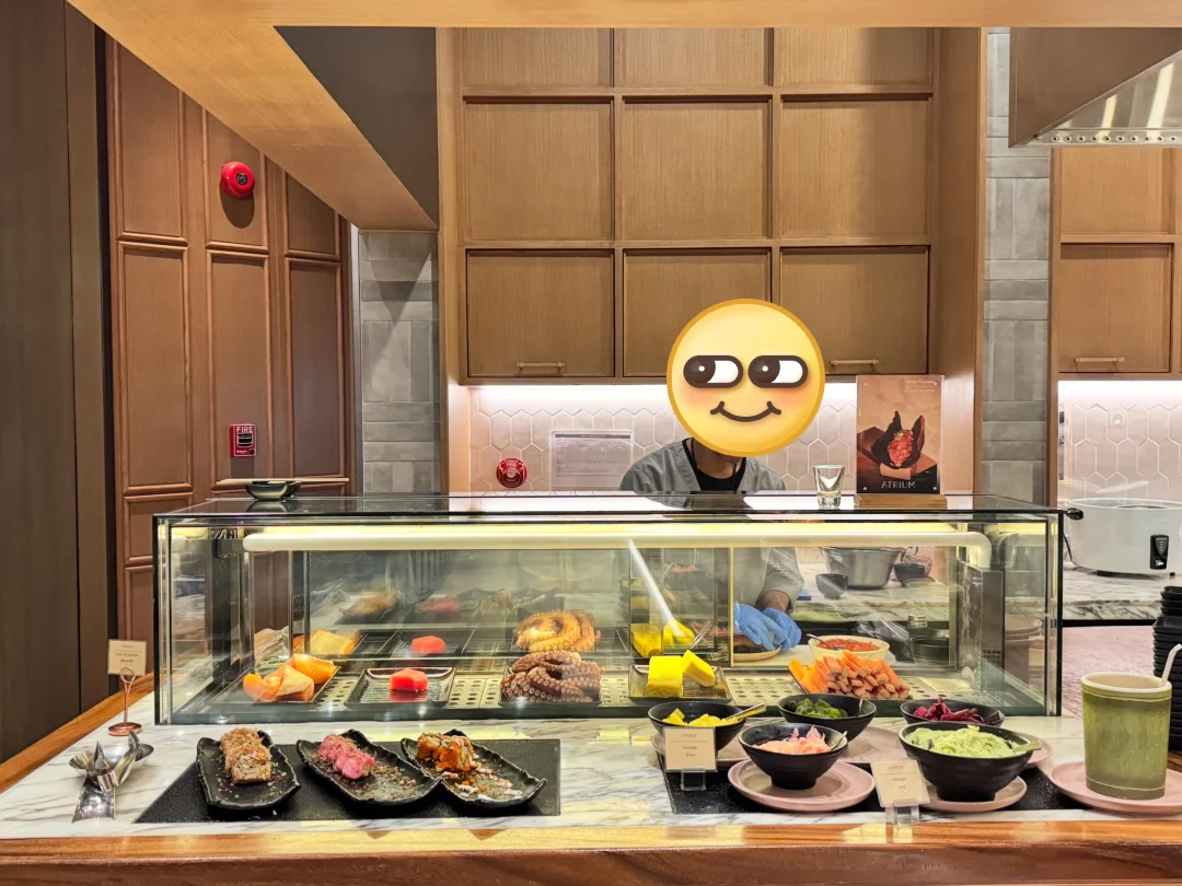 整只蟹、烤大虾、生鱼片、寿司、热菜、甜品全都在线而且不是那种“种类多但味道一般”的酒店自助,是很多菜都能吃出认真做的程度[偷笑R]