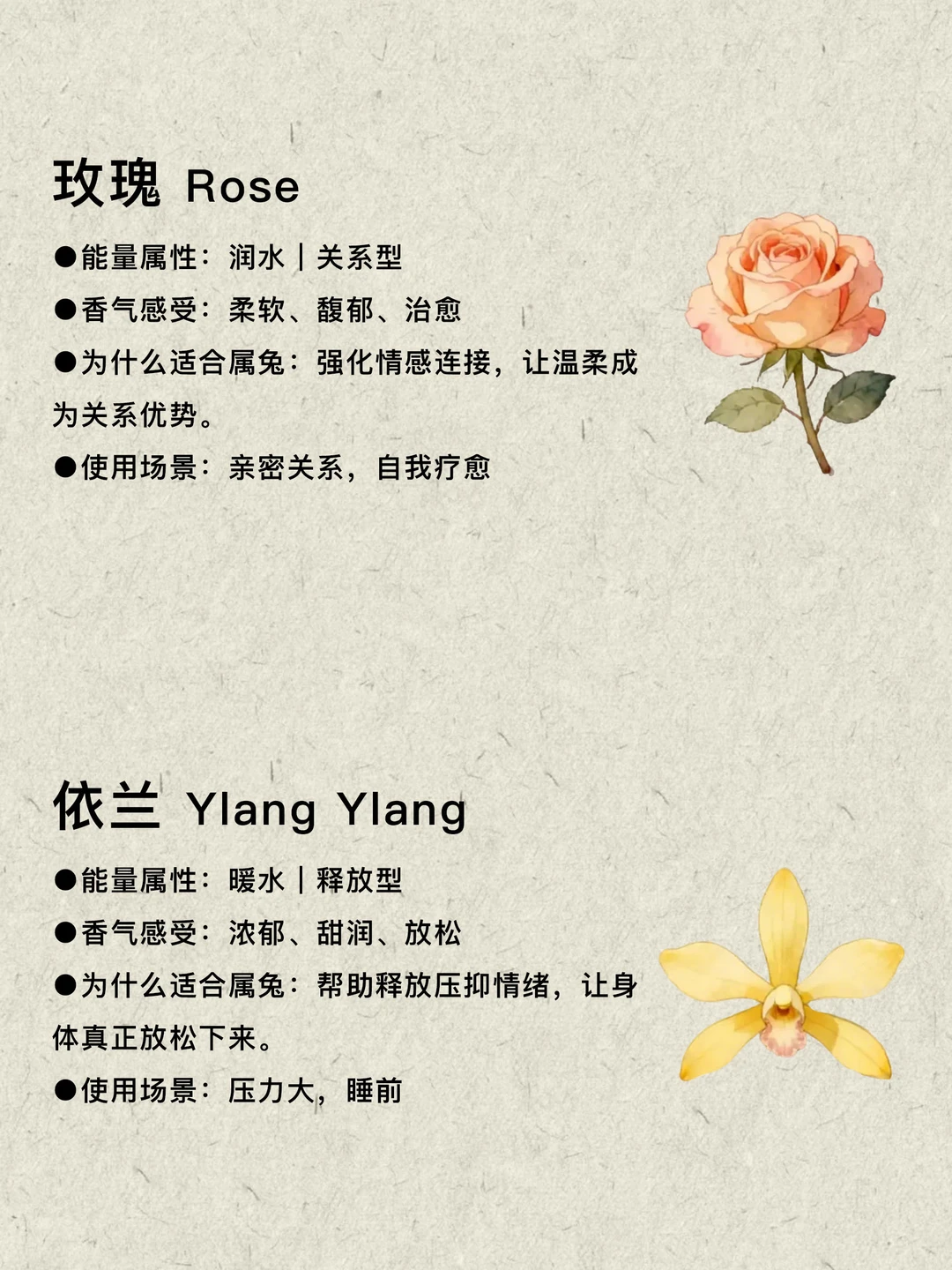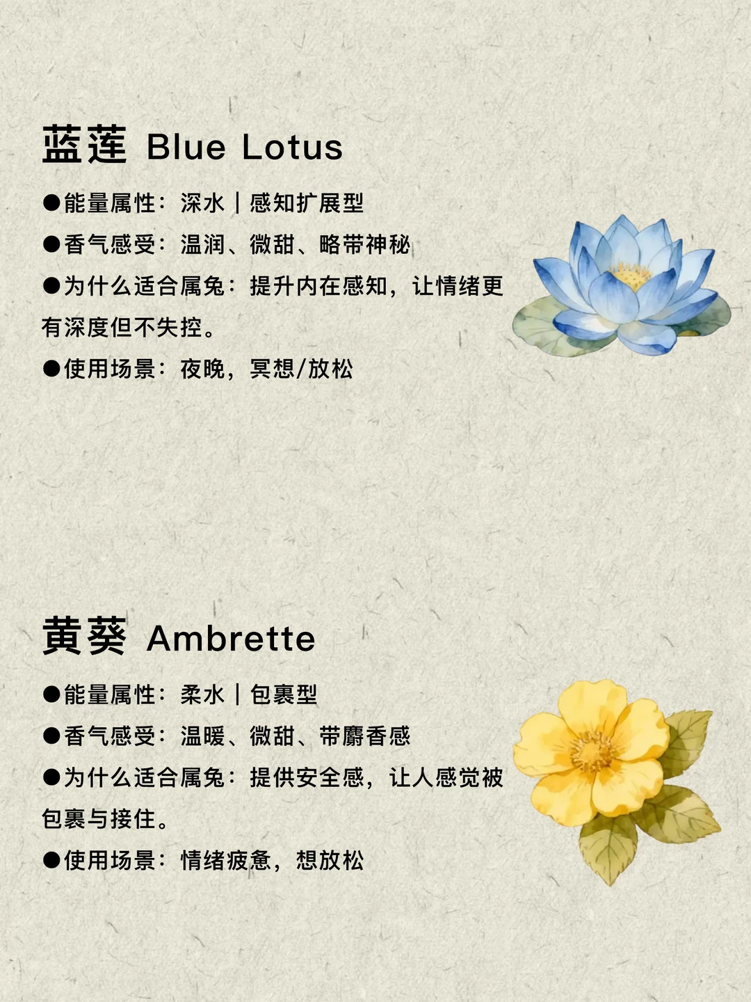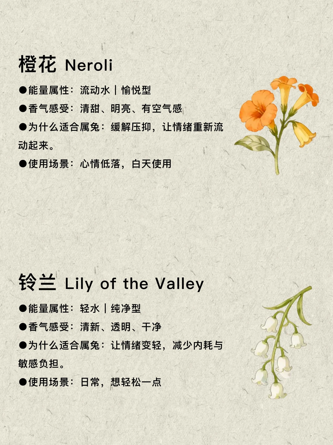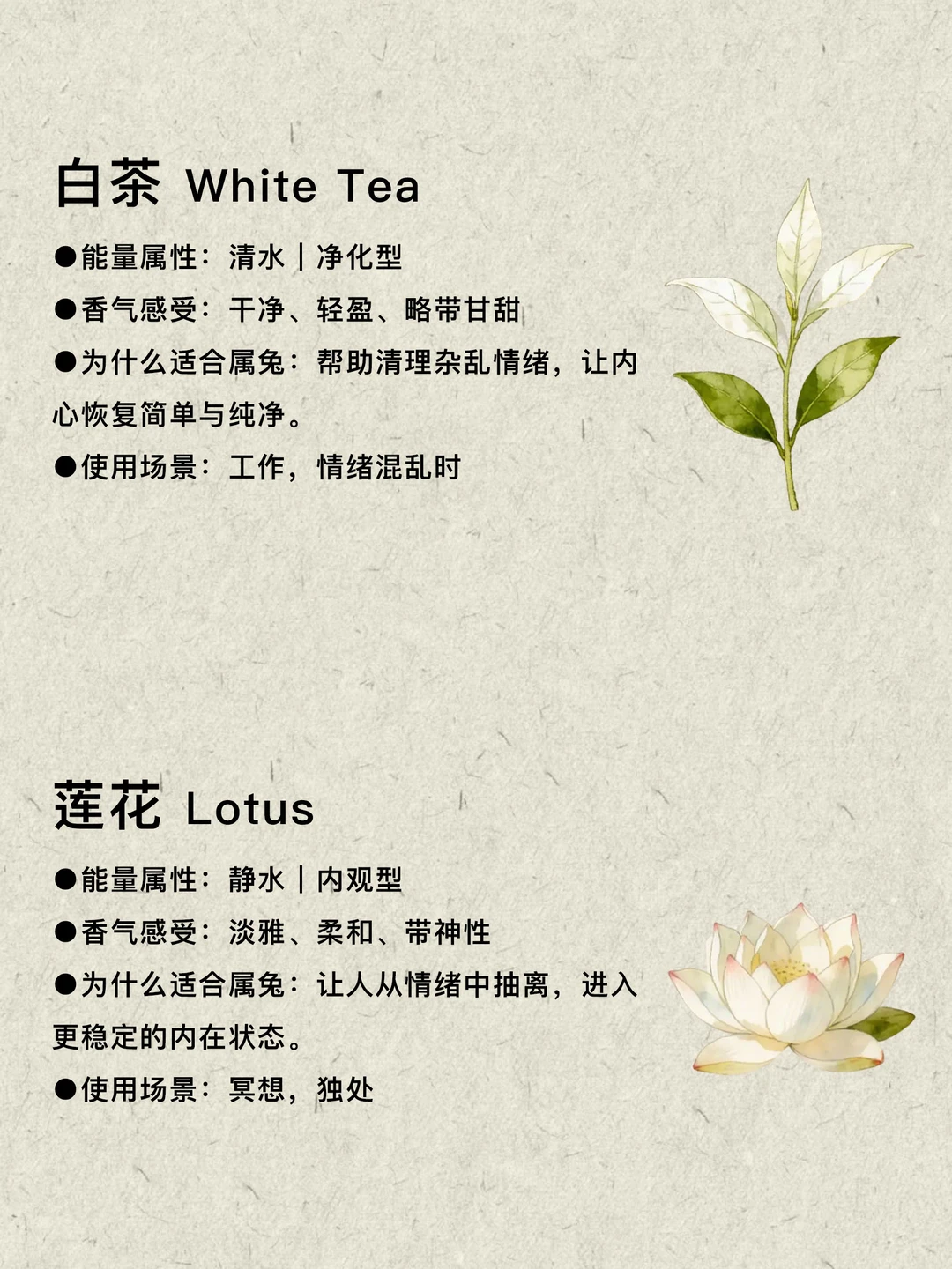 适合喜水属兔的10款植物:睡莲、茉莉、白茶、莲花、橙花、铃兰、蓝莲、黄葵、玫瑰、依兰,它们带来的不是强烈外放的能量,而是一种温和而持续的流动感,让情绪慢慢舒展开,让内心逐渐变得柔软而有边界,让生活在不知不觉中回归平衡。选一个与你气场贴合的气味,让自己慢慢流动起来。