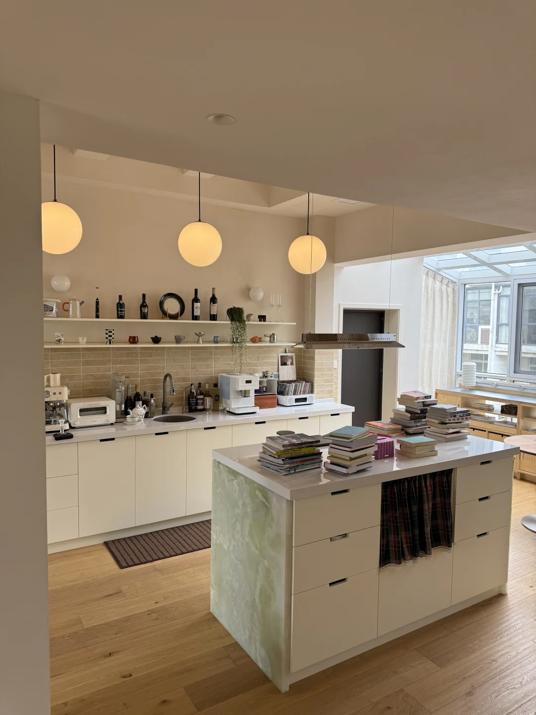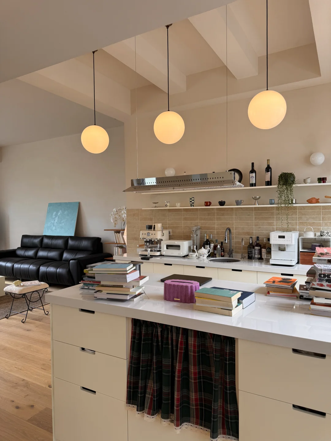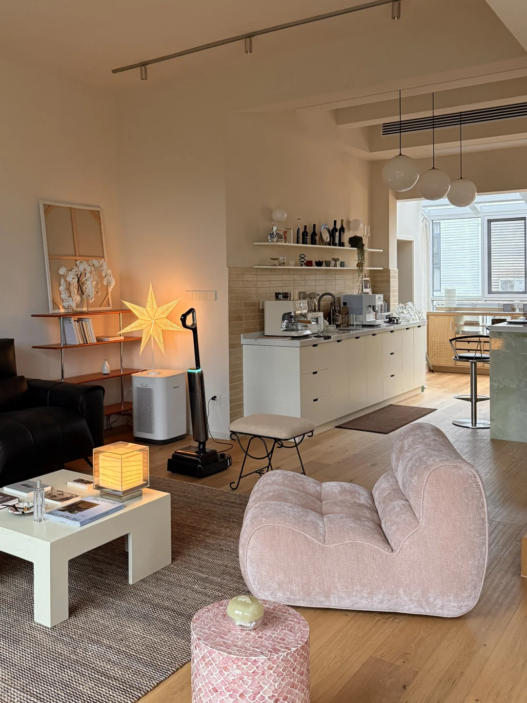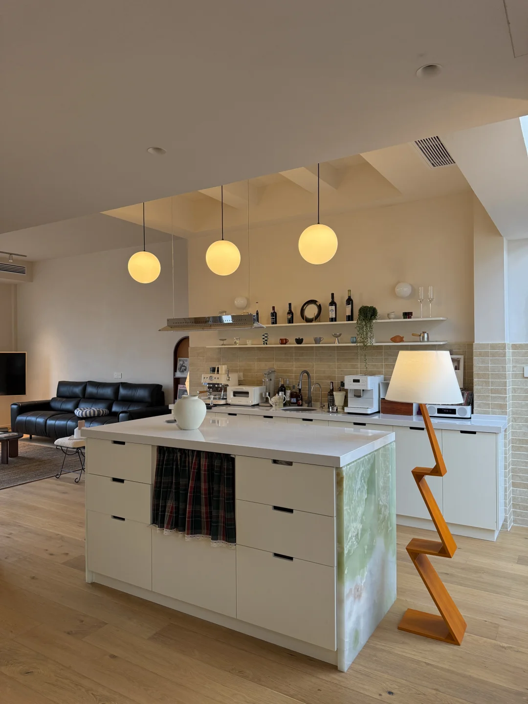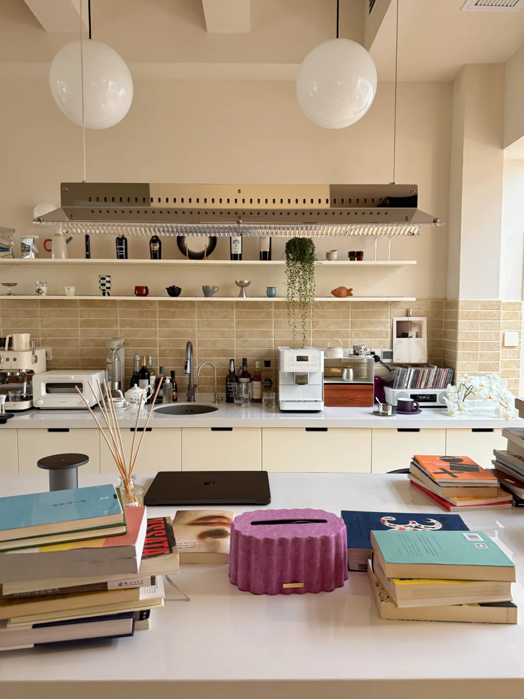 新家装修我就一定要大的一排餐边柜,下柜储物空间拉满,上排做置物架留点呼吸感,摆上自己喜欢的杯子什么的。台面进深60能放下多数咖啡机,柜体高90方便站着操作。颜色做的暖白色,比较不容易看腻,也白搭各种黑色白色小家电。