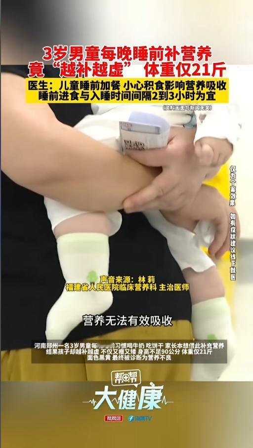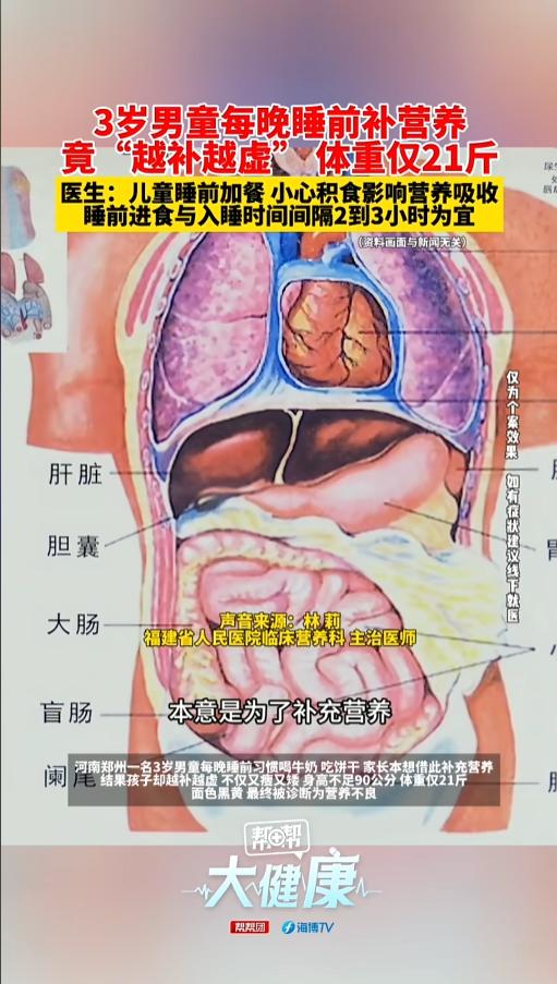 信息来源:《第820集:3岁男童每晚睡前补营养 竟“越补越虚” 体重仅21斤 医生:儿童睡前加餐 小心积食影响营养吸收 睡前进食与入睡时间间隔2到3小时为宜》第一帮帮团