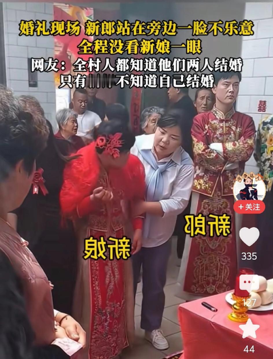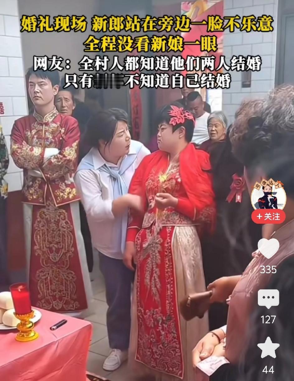 新郎刚刚娶了一个唐氏的新娘,一点不乐意,全程都没有看新娘一眼。全村人都知道他俩结婚,只有新郎不知道自己结婚。婚礼现场现在很委屈。双手抱在胸前头扭到一边。这个婚非结不可吗?没苦硬吃,往后的苦日子,是没有尽头的。和自己不爱的人在一起就等于是慢性自杀。