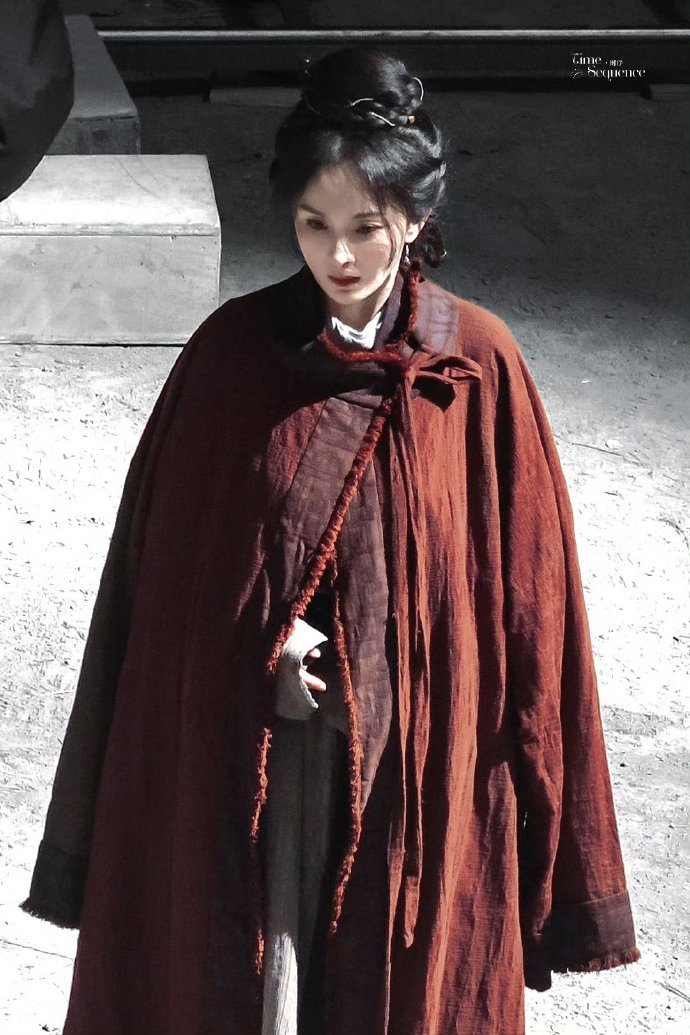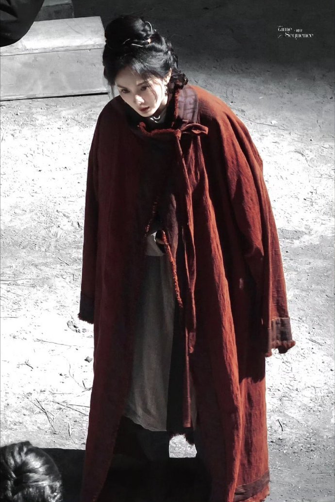 杨幂红麻衣披风路透冯湮儿美成啥了真就披着麻袋都好看!我家太后