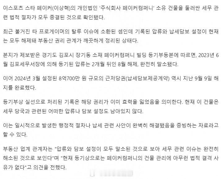 此次事件可以说是因近期其他职业选手爆出的逃税问题而被一同提及,不过此前登记的查封及纳税担保目前均已全部解除,相关不动产的权利关系已经完全整理干净。从查封与担保设定均已注销来看,税务相关问题应已完全消除,目前从登记情况来看,Faker Company在建筑管理方面不存在任何法律上的问题或瑕疵。
