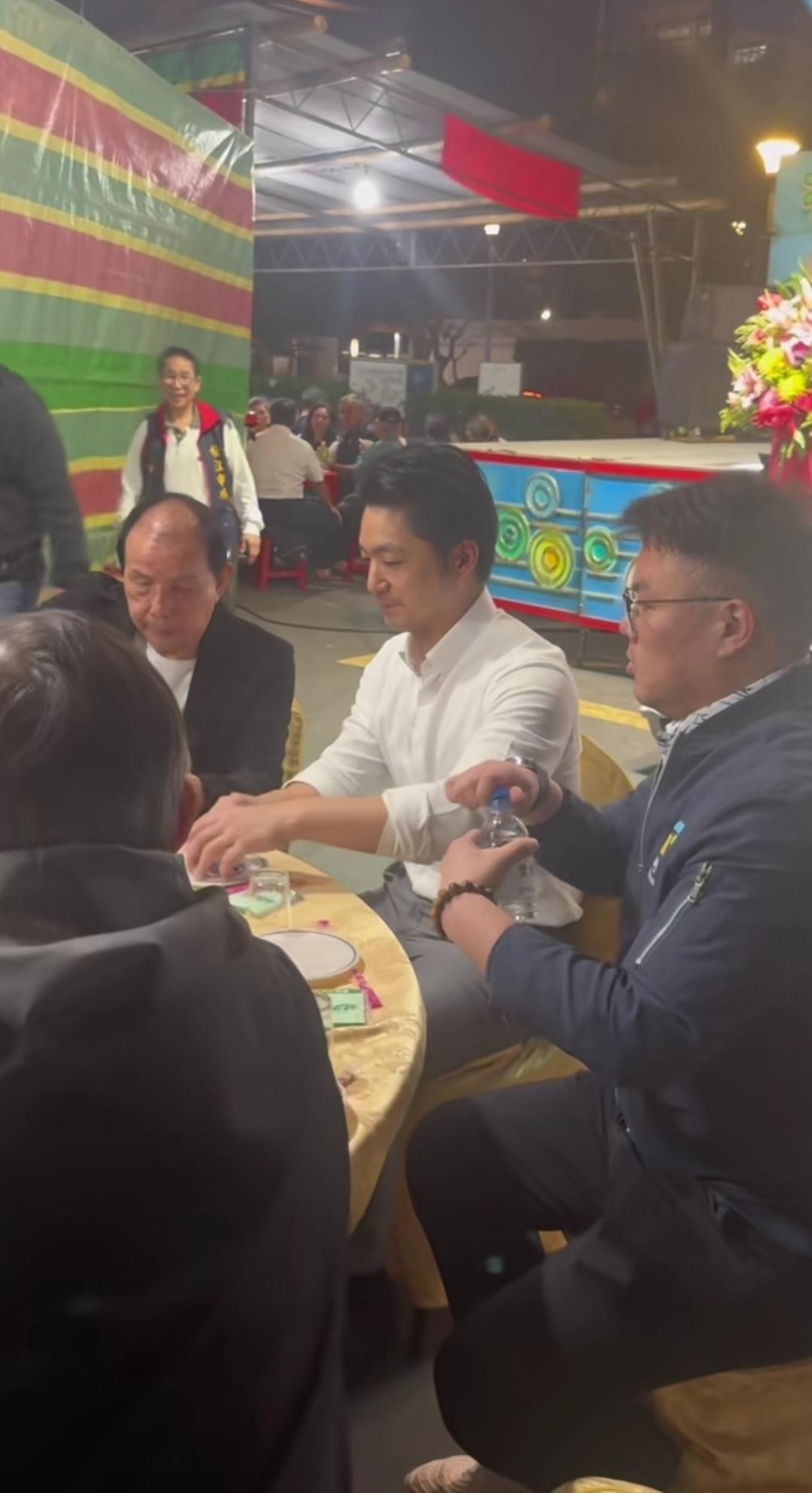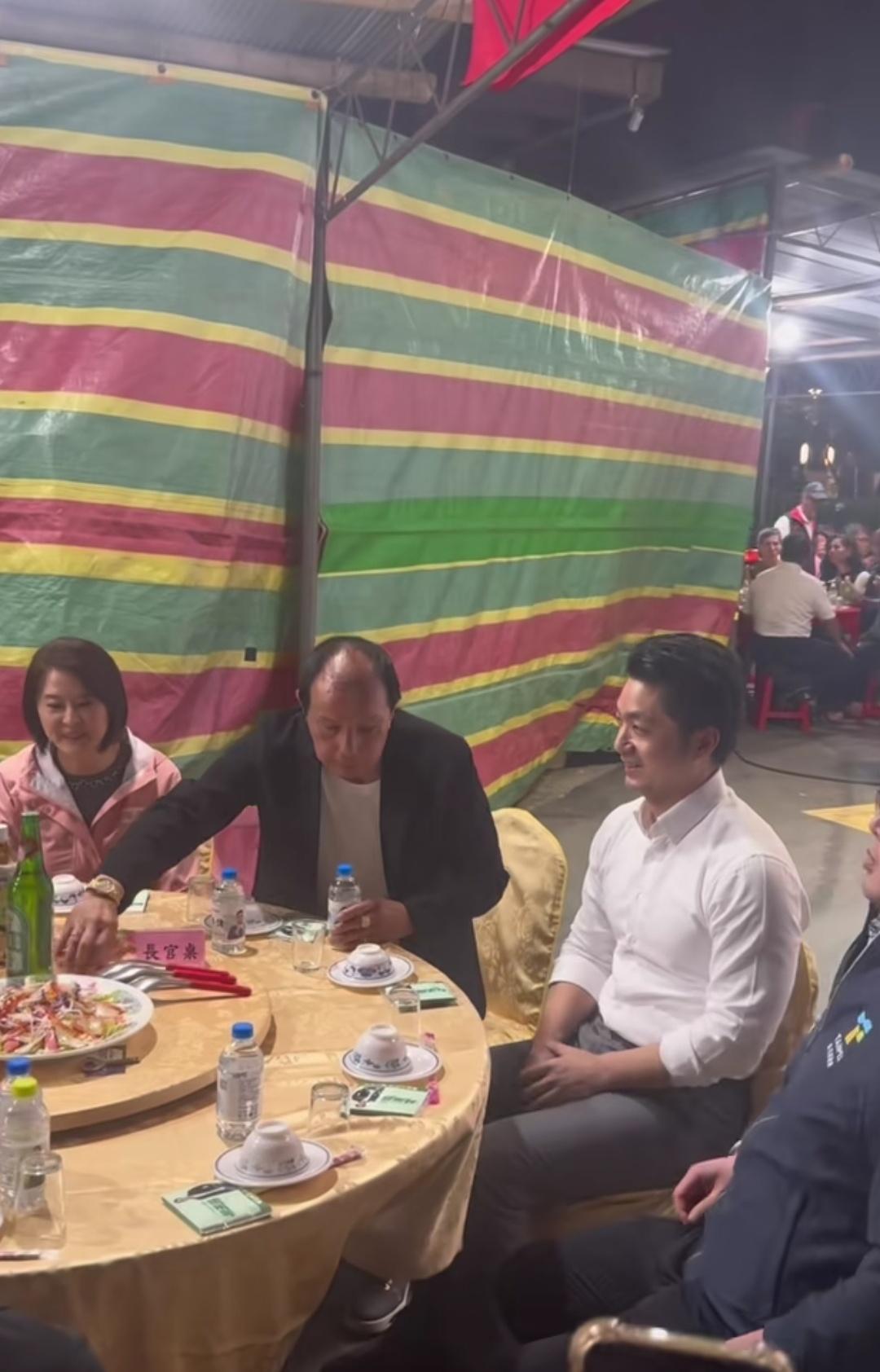 蒋万安像是参加农村大席,旁边有一个临时搭建的舞台,还有一堵用塑料布隔的挡风墙,远处还有几桌。吃饭的地方直接摆在了户外,与我们村上办事没啥两样,看到这场景真让人感慨啊!