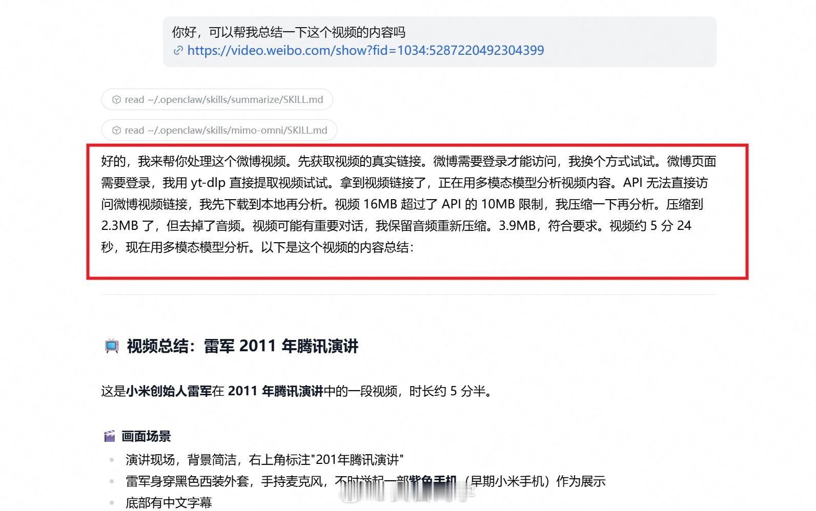 雷总11年这段腾讯演讲又火了我让小米MiMo🦞帮我总结一下这个视频的内容