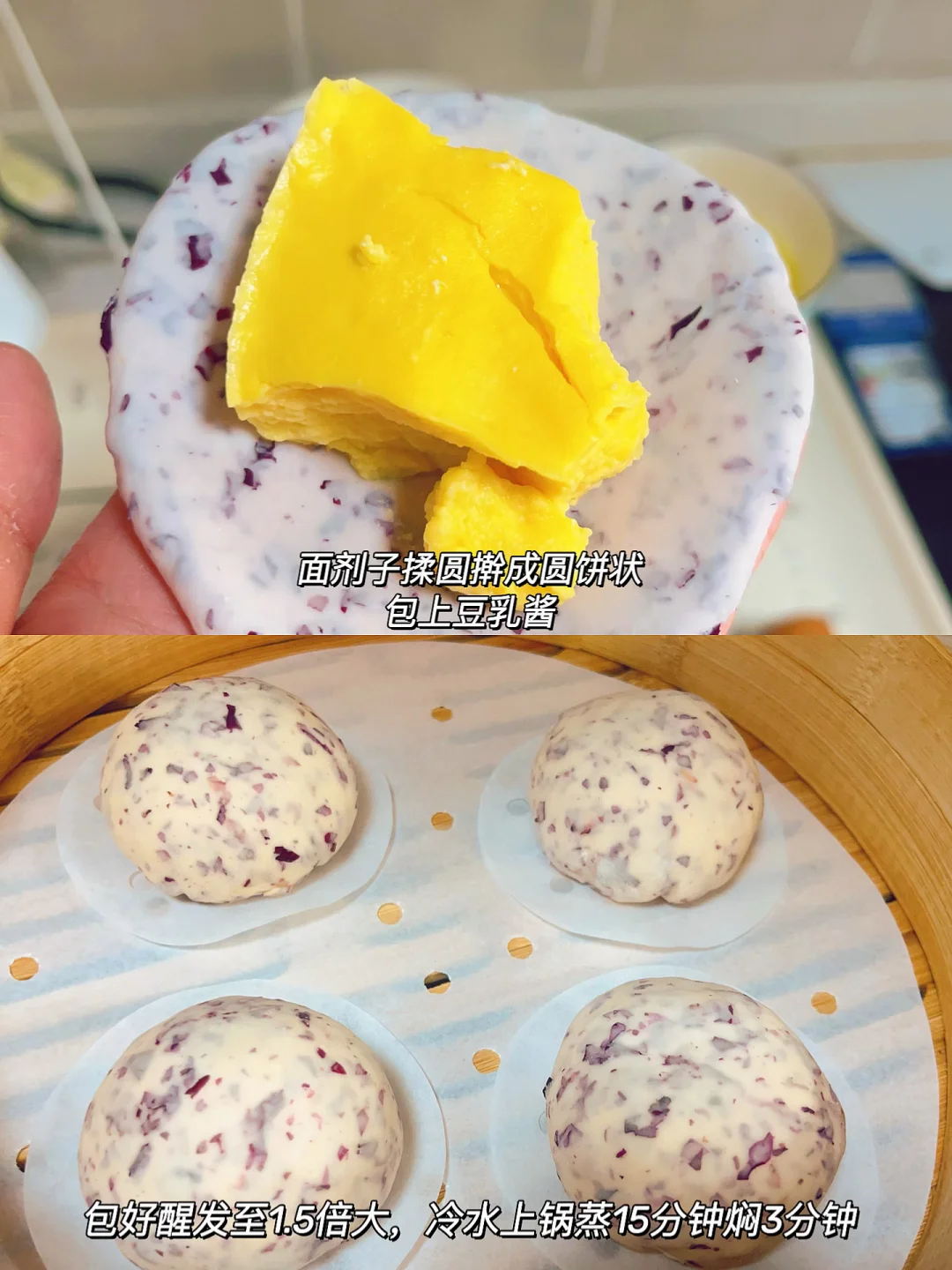 4⃣️包好后醒发至1.5倍大,冷水上锅蒸15分钟焖3分钟